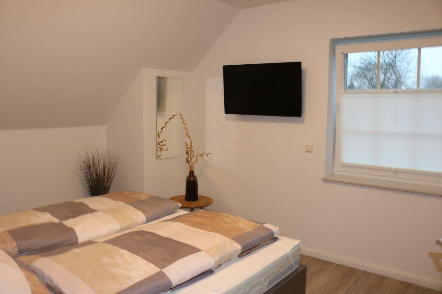 Ein Schlafzimmer mit komfortablen Doppel-Boxspringbett befindet im Erdgeschoss, zwei weitere Schlafräume mit Doppel-Boxspringbetten und großen TV-Geräten im Obergeschoss. Hier befindet sich auch ein zweites Duschbad (mit Fön).