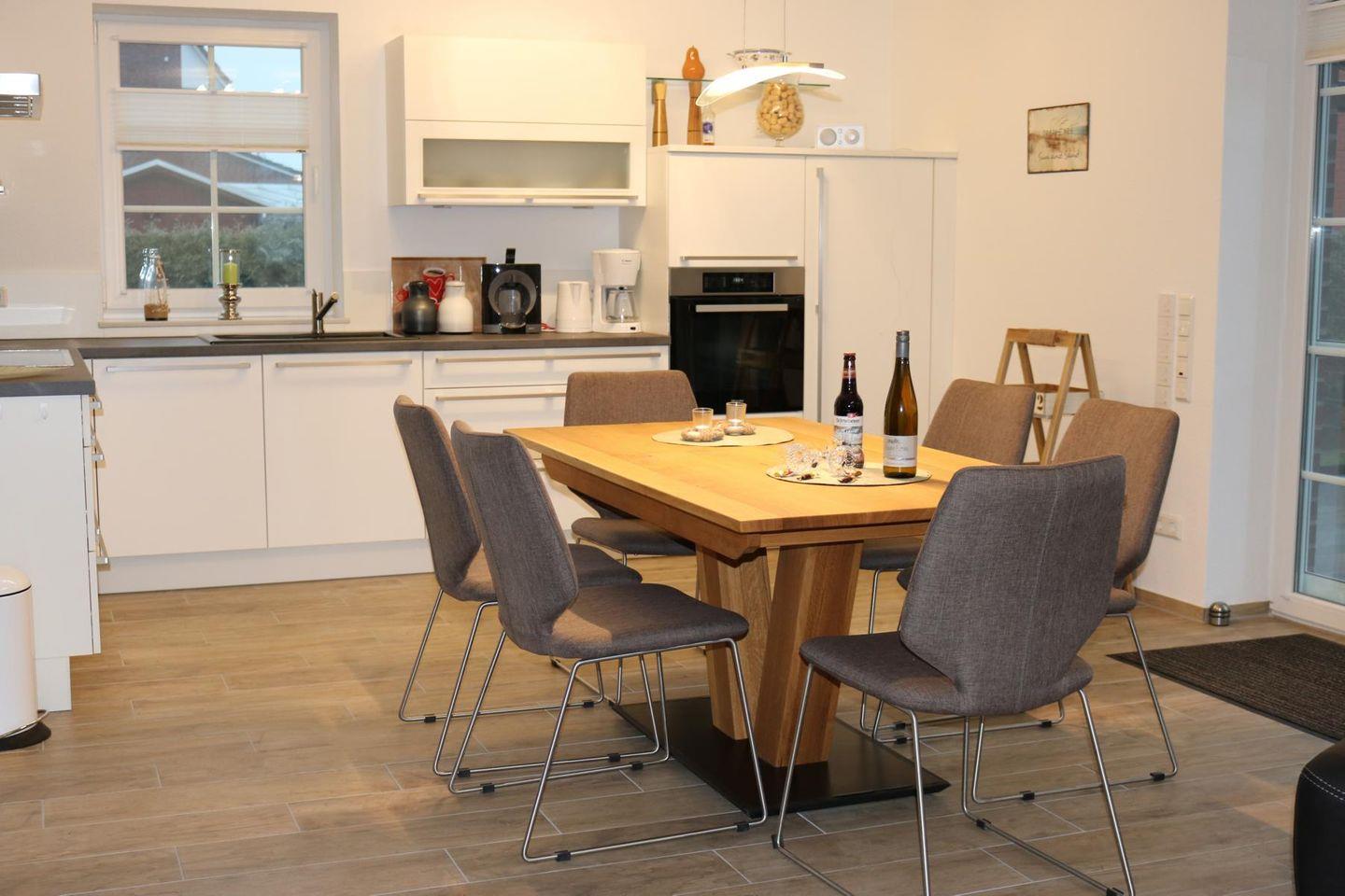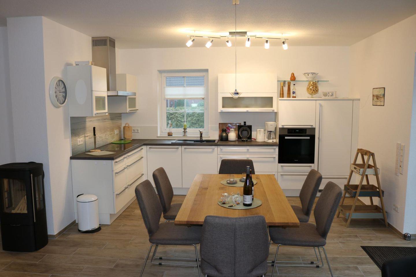 Der großzügige Wohn- Essbereich mit Kaminofen und gemütlicher Eckcouch mit großem TV, sowie einer hochwertigen Einbauküche mit Induktionskochfeld, Backofen, Mikrowelle, großer Kühl/-Gefrierkombination, Geschirrspülmaschine, Kaffeemaschine, Krups Kaffeepadmaschine, Eierkocher, Toaster u. v. m. lässt keine Wünsche offen.