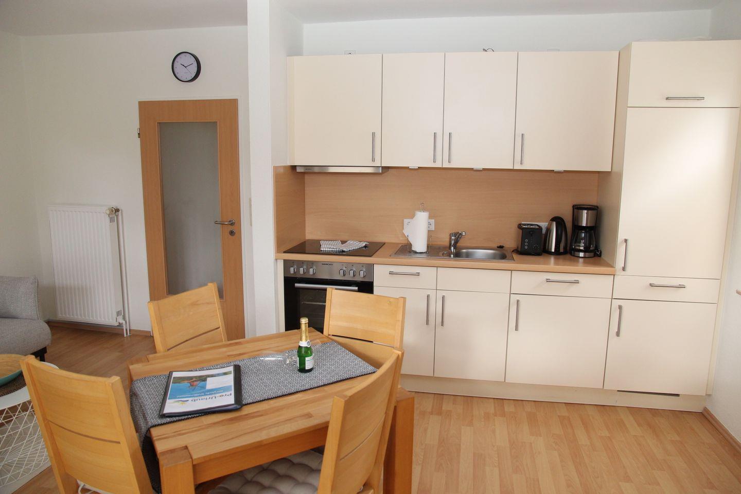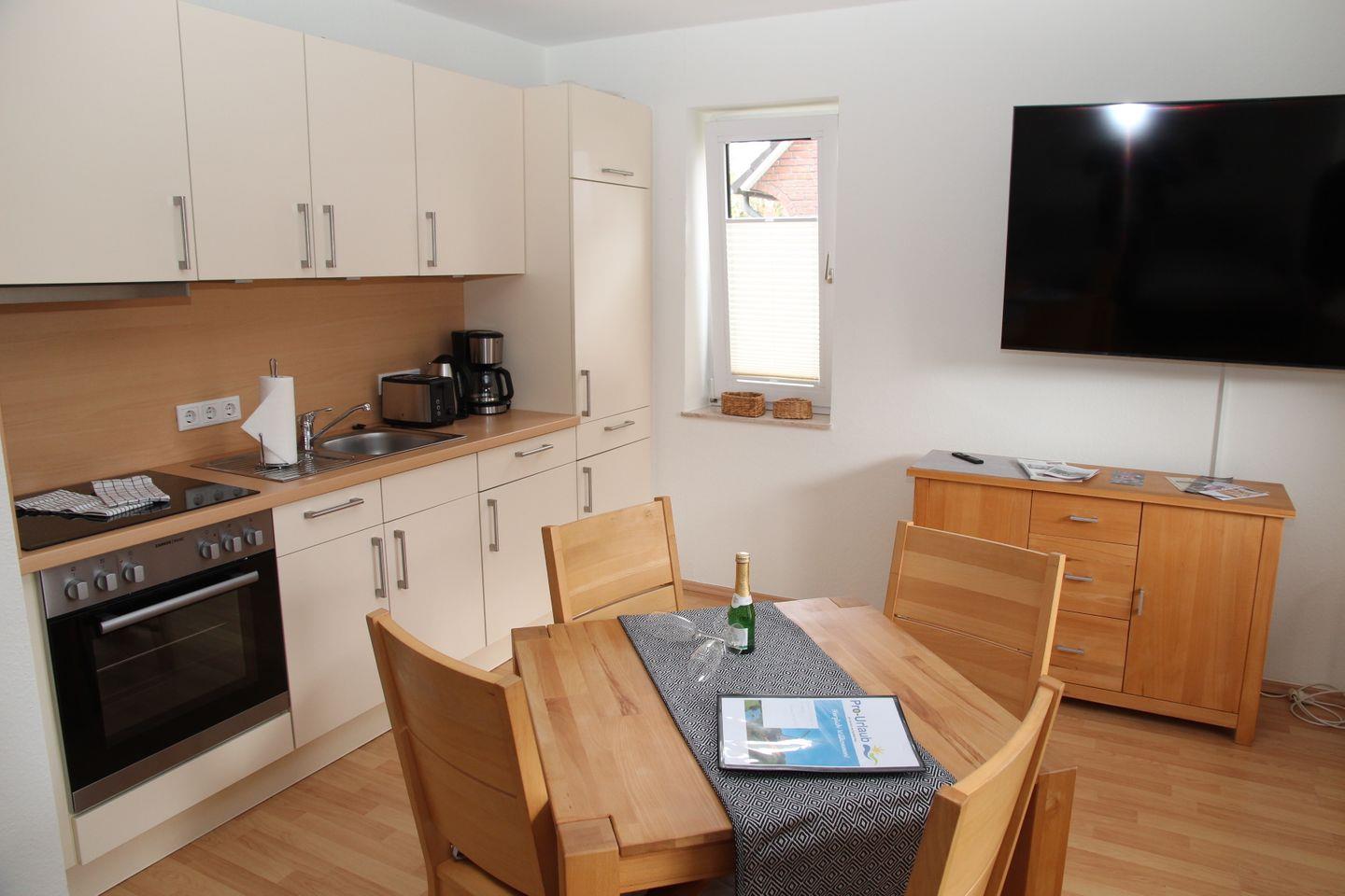 Schöner Wohn-/Essbereich mit voll ausgestatteter Küche (Kühlschrank mit Gefrierfach, Geschirrspüler, Herd mit Ceranfeld, Backofen, Wasserkocher, Kaffeemaschine, Toaster,