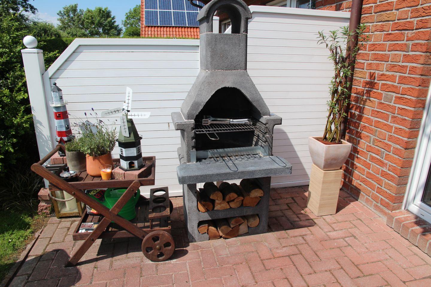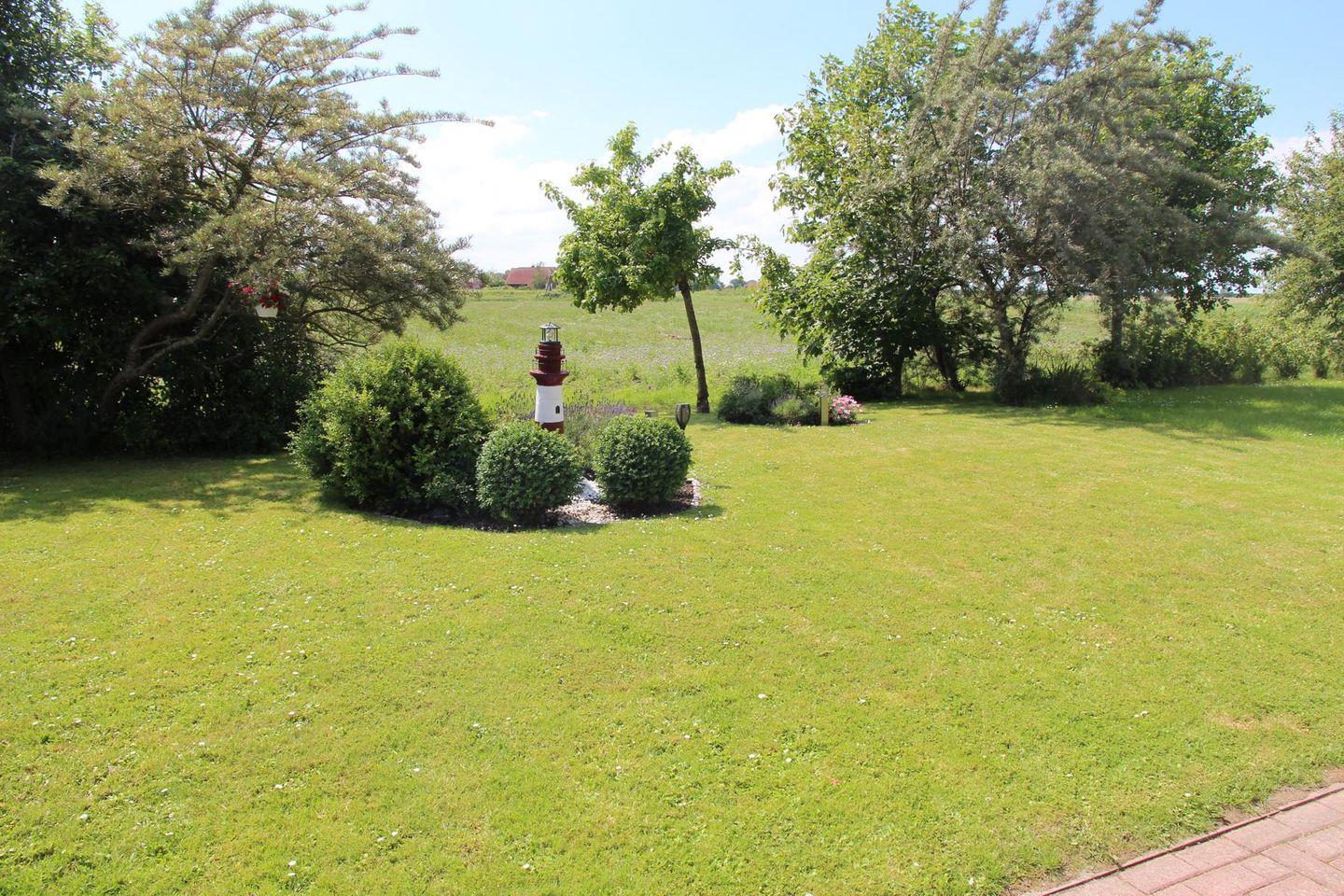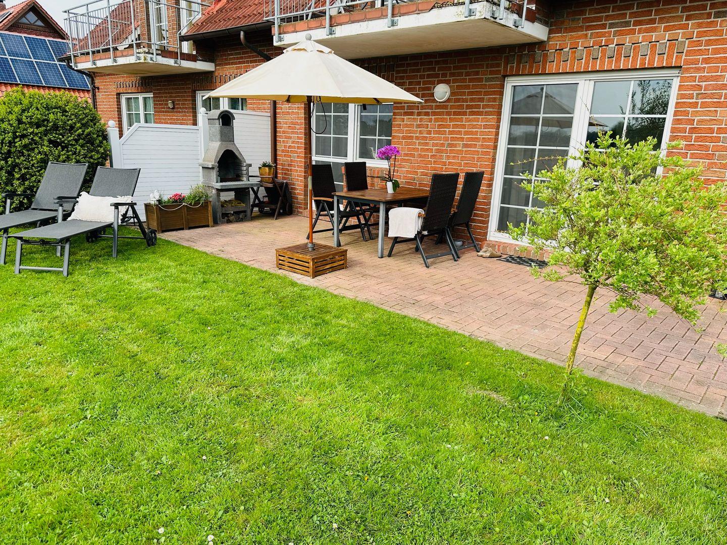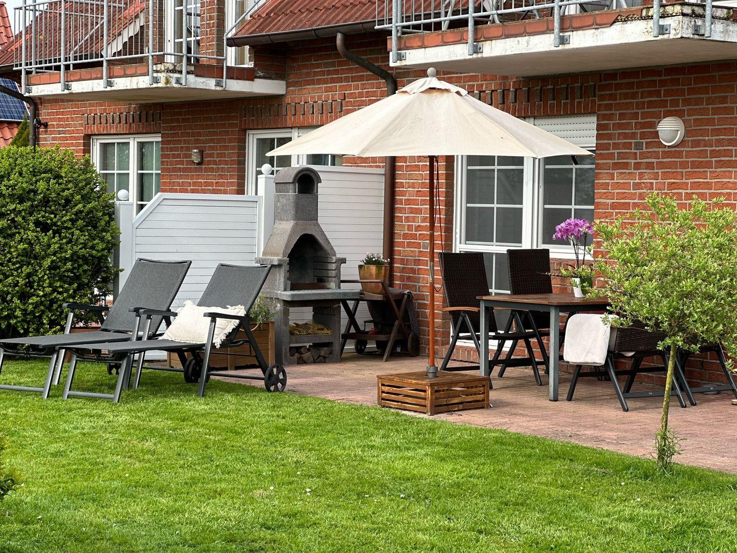 Für gemütliche Abende sorgt die möblierte Terrasse (begehbar von Schlaf- und Wohnzimmer). Hier können Sie den ganzen Tag ungestört und in völliger Ruhe die Sonne genießen. Ein Grillkamin, eine gemütliche Essecke und Sonnenliegen stehen zur Verfügung sowie ein sehr schön angelegter Garten mit Blick über die dahinterliegenden Felder bis hin zum Deich.