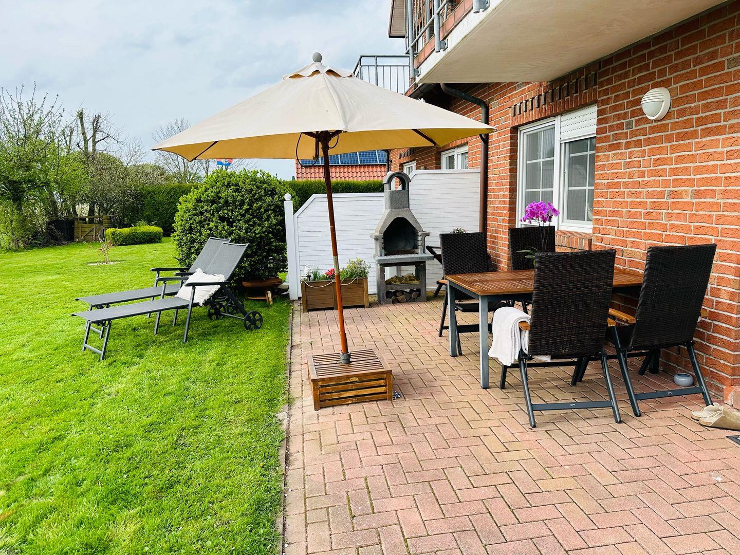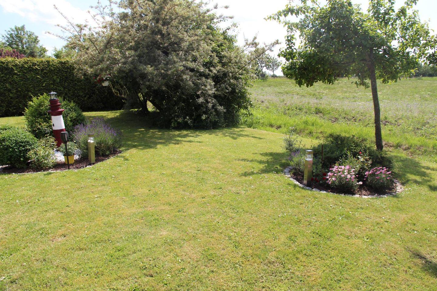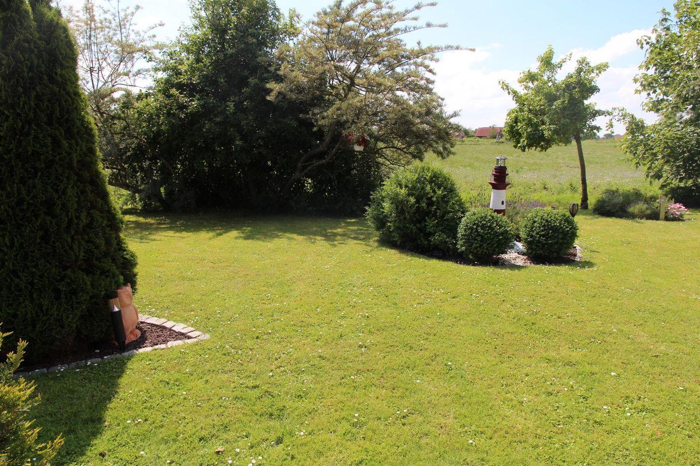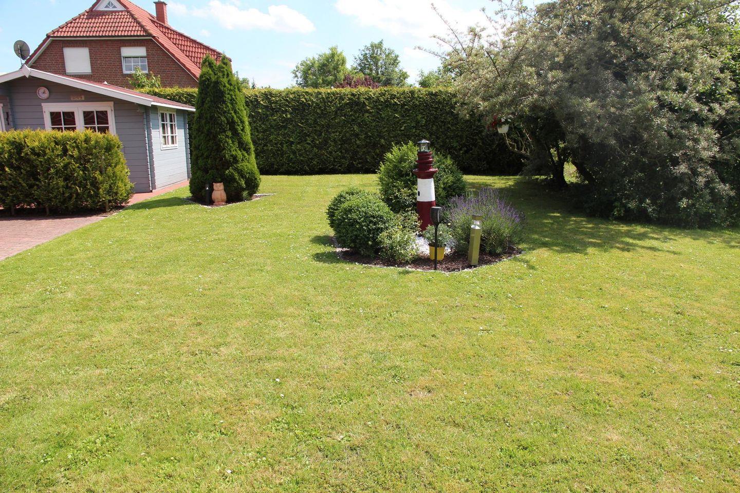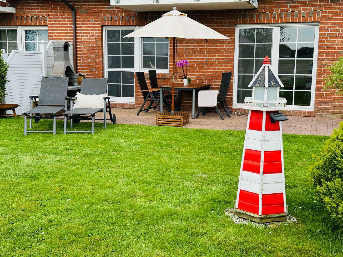 Für gemütliche Abende sorgt die möblierte Terrasse (begehbar von Schlaf- und Wohnzimmer). Hier können Sie den ganzen Tag ungestört und in völliger Ruhe die Sonne genießen. Ein Grillkamin, eine gemütliche Essecke und Sonnenliegen stehen zur Verfügung sowie ein sehr schön angelegter Garten mit Blick über die dahinterliegenden Felder bis hin zum Deich.