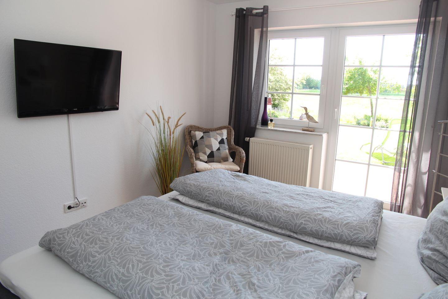 Das Schlafzimmer verfügt über ein hochwertiges Doppel-Boxspringbett, Kleiderschrank und TV.