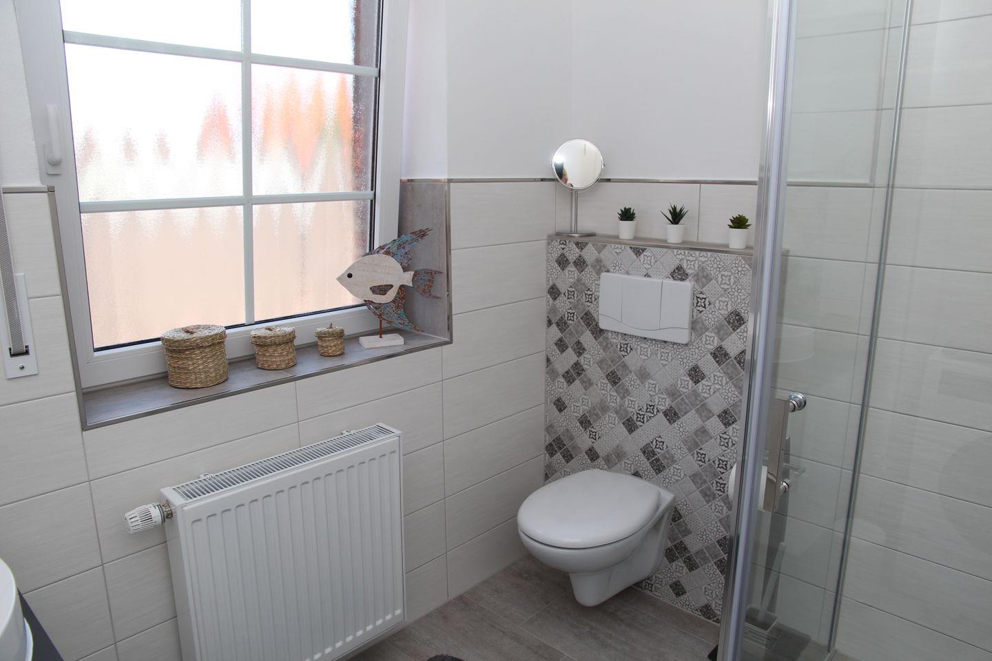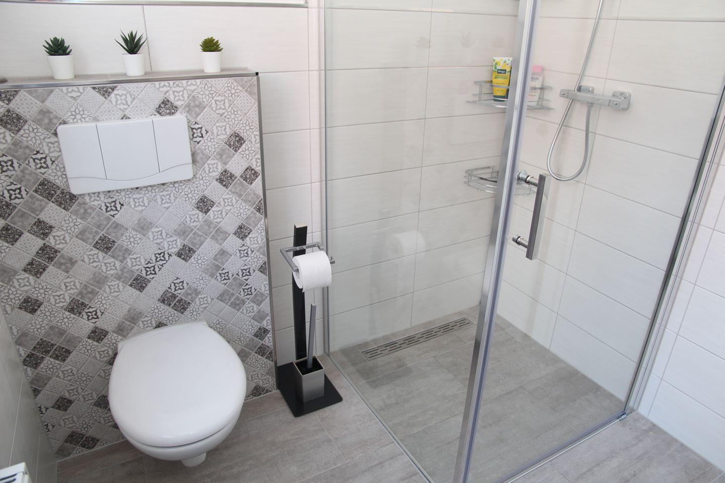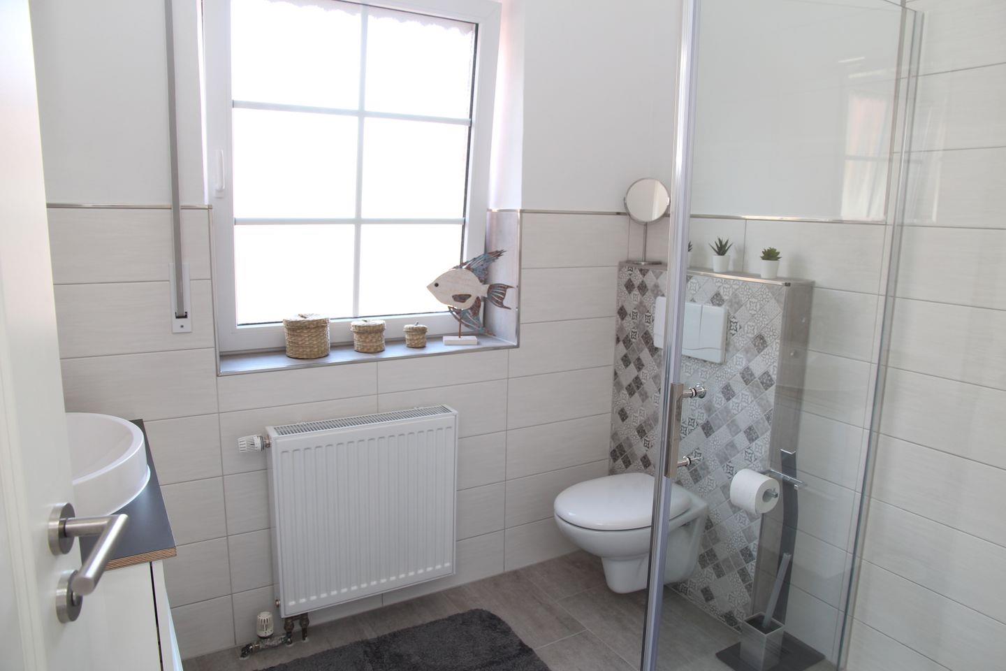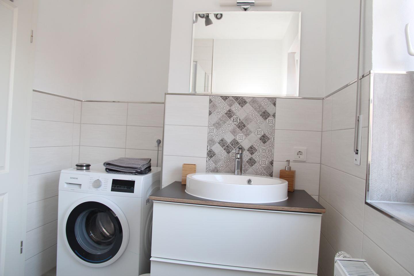 Das Tageslicht-Duschbad bietet eine ebenerdige Dusche, Waschmaschine, Föhn sowie Fußbodenheizung für ein angenehmes Gefühl.