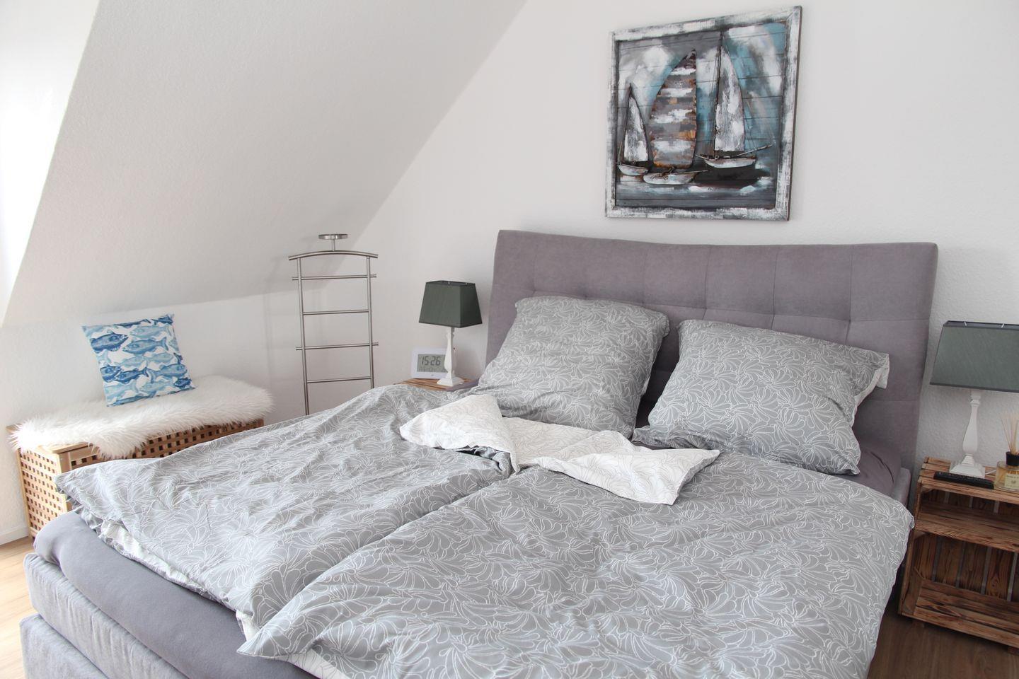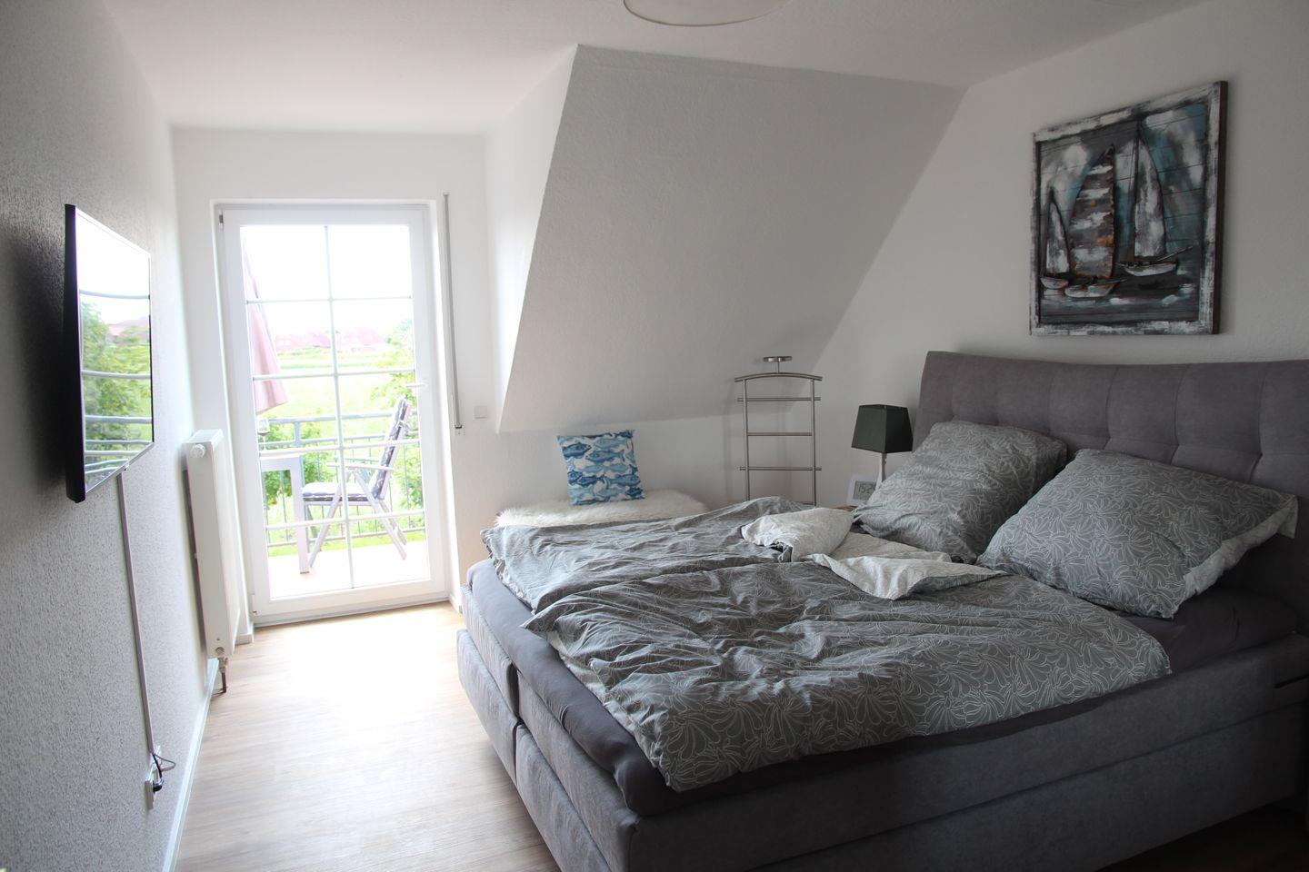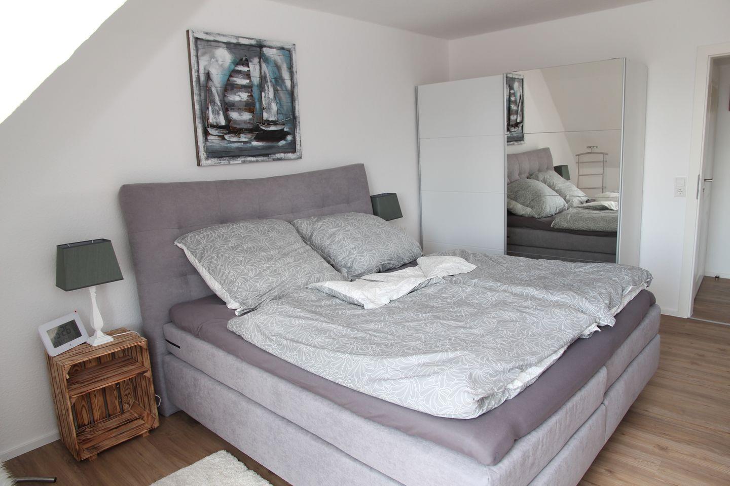 Das Schlafzimmer verfügt über ein hochwertiges Doppel-Boxspringbett, Kleiderschrank und TV.