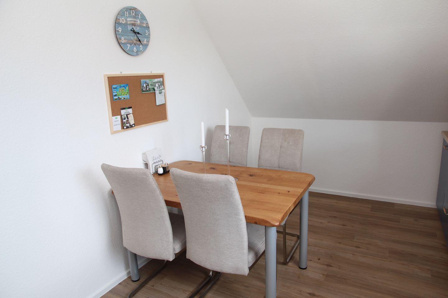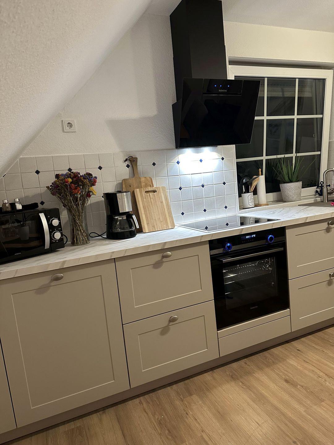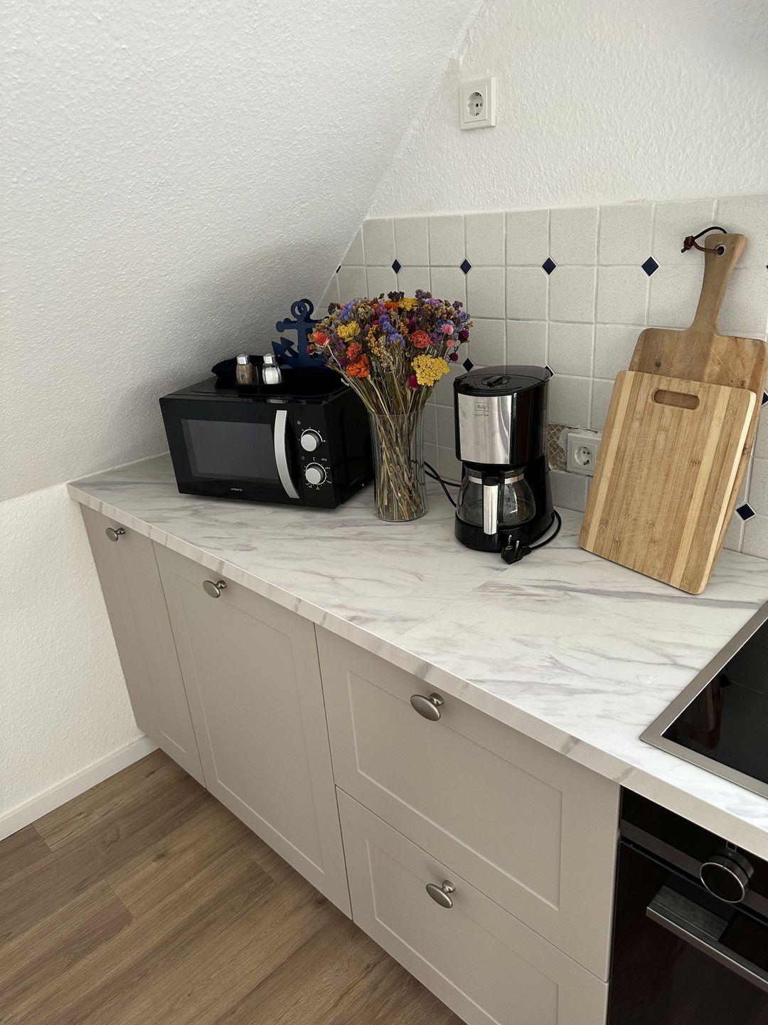 Die moderne Küche (neu in 2025) ist ausgestattet mit einem Essplatz für 4 Personen, Backofen, Kühlschrank mit Gefrierfach, Geschirrspülmaschine, Mikrowelle, Wasserkocher und Kaffeemaschine (Melitta). Zudem finden Sie an der Pinnwand viele interessante Ausgehmöglichkeiten, Aktivitäten und Informationen (z. B. Fährfahrten) rund um Greetsiel.