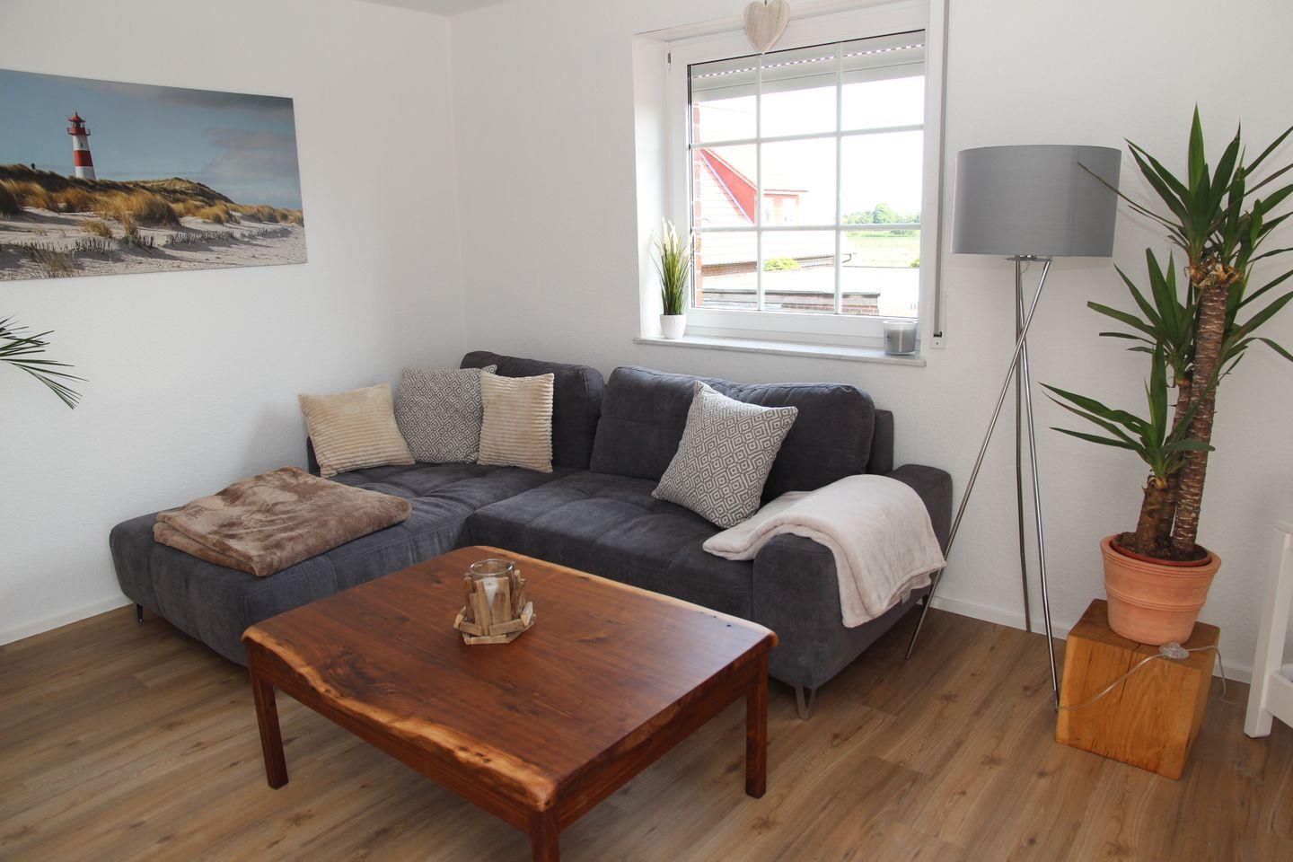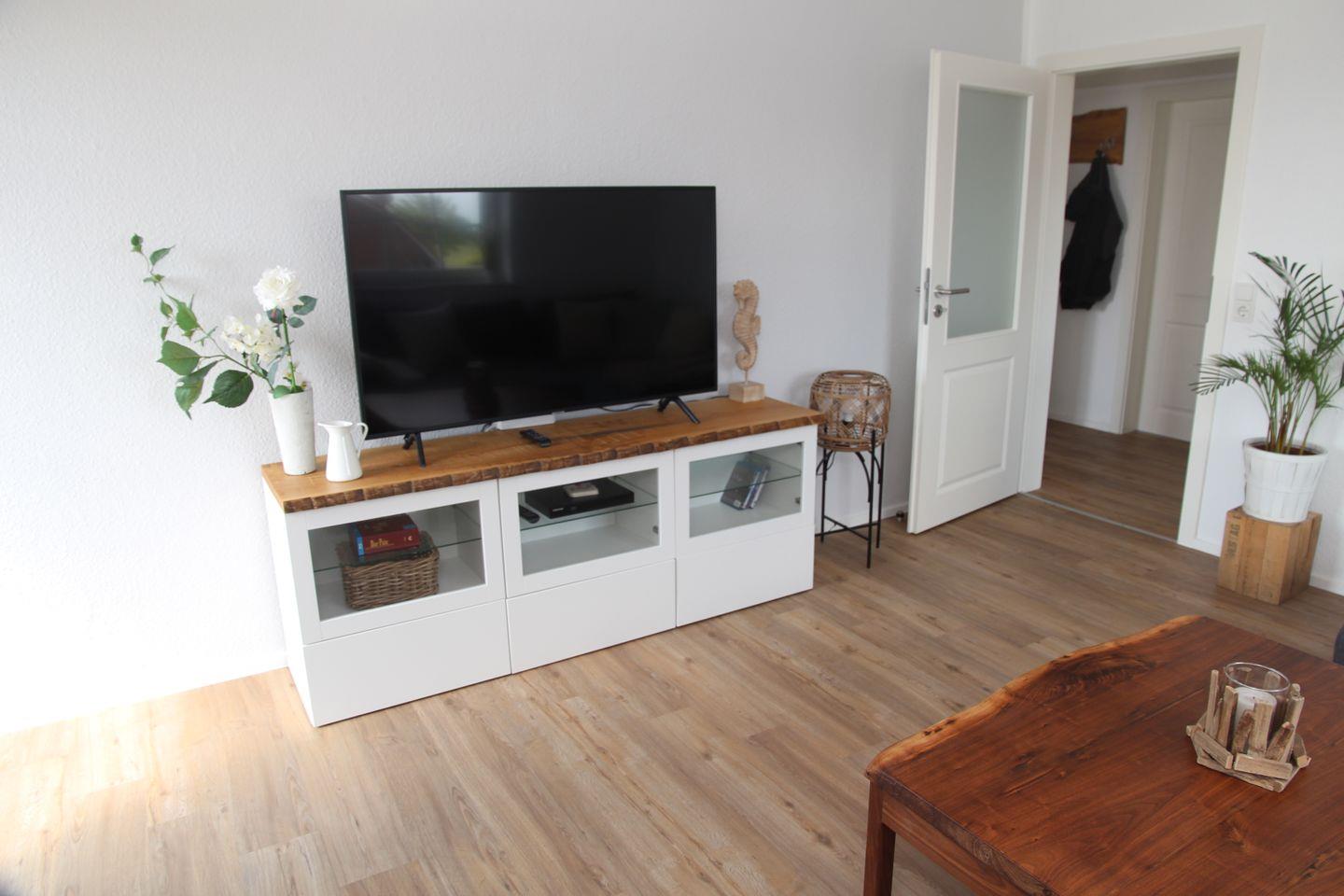 Im gemütlichen Wohnzimmer erwartet Sie eine komfortable Sofaecke mit Schlaffunktion (Boxspring), sodass sich die Wohnung auch für bis zu 4 Personen eignet. Zudem steht Ihnen ein großer Fernseher, ein Blu-Ray-Player sowie ein Radio zur Verfügung. Alle Geräte in der FEWO sind Markenfabrikate. Für gemütliche Abende zu Hause steht Ihnen eine Auswahl an DVDs bereit.