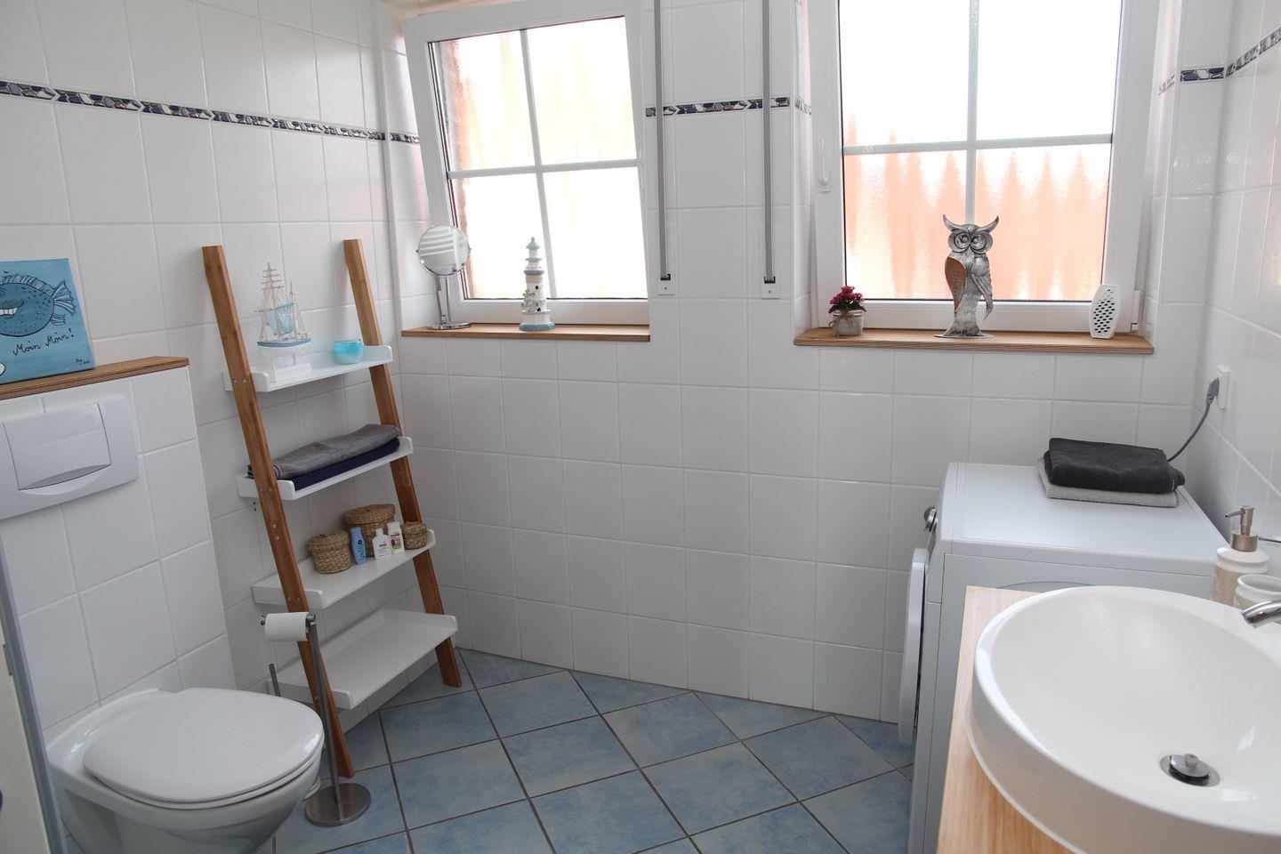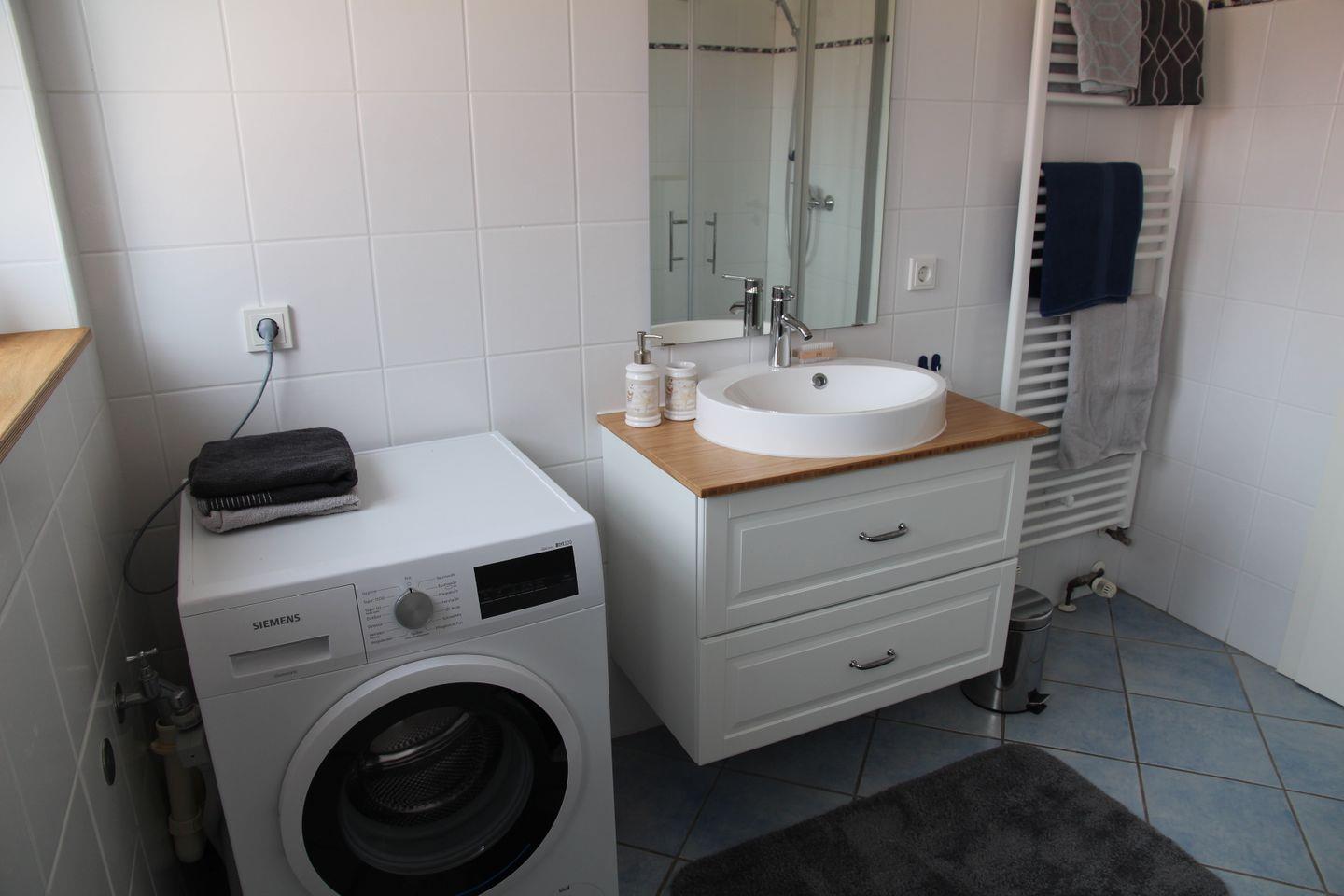 Das großzügige Tageslicht-Duschbad verfügt über eine Waschmaschine, Föhn und ausreichend Platz für Ihre Kosmetika.
