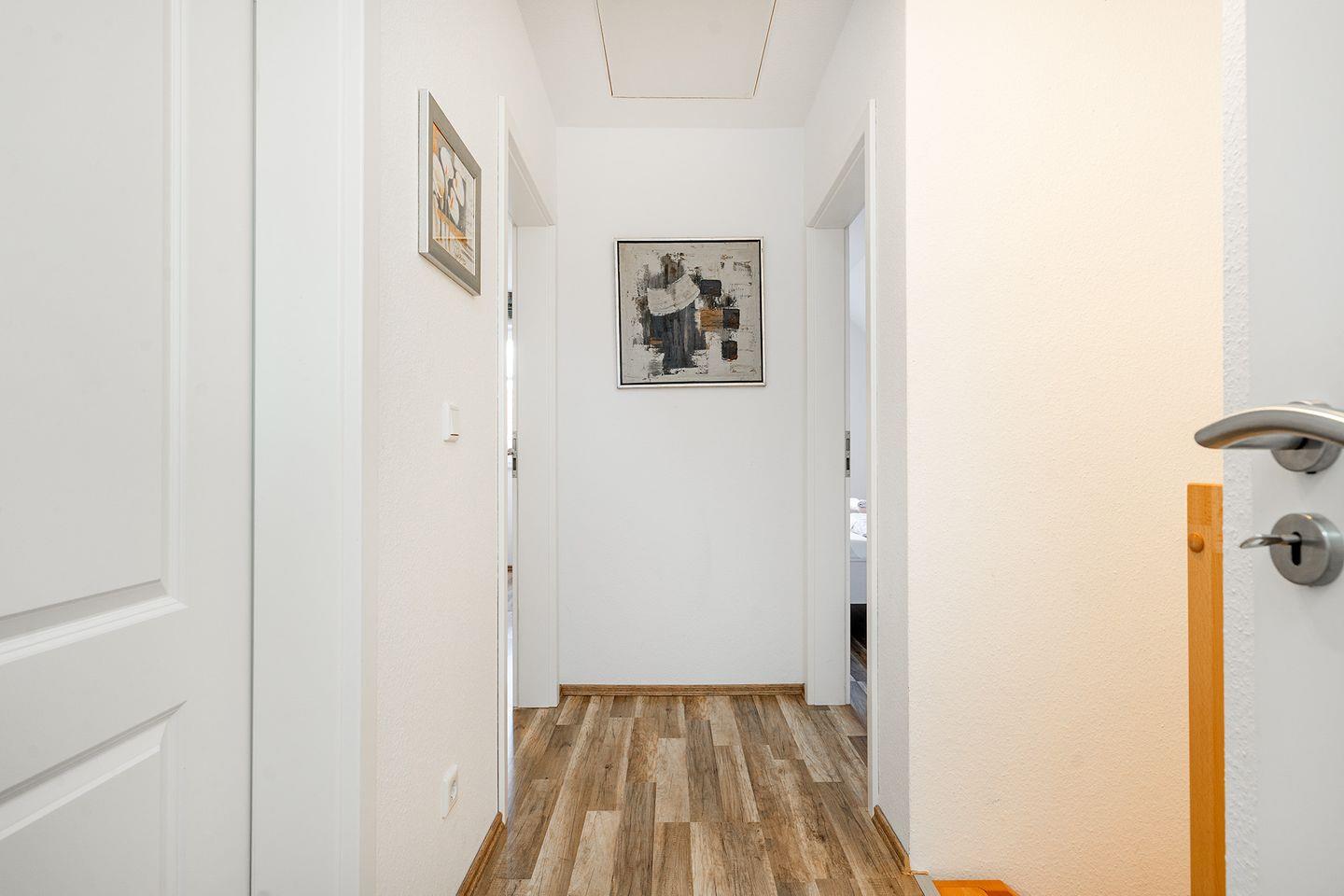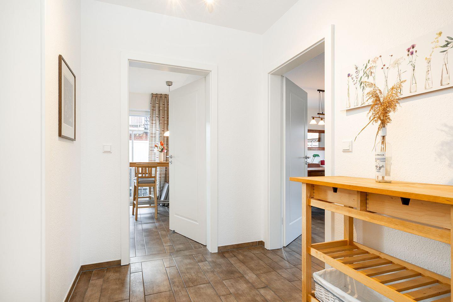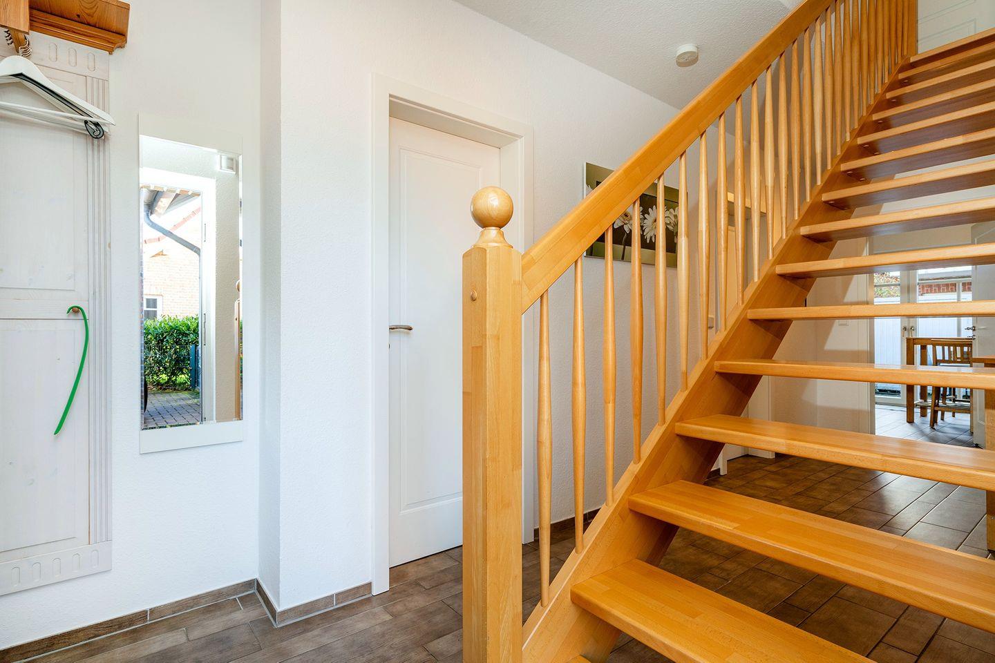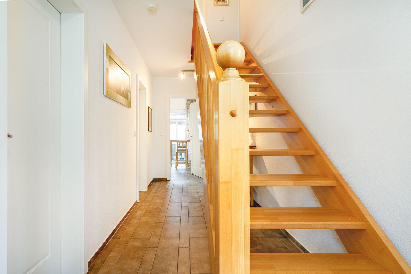 Der Flur ist mit einer Garderobe ausgestattet, von hier geht es über eine Holztreppe in die 1. Etage.