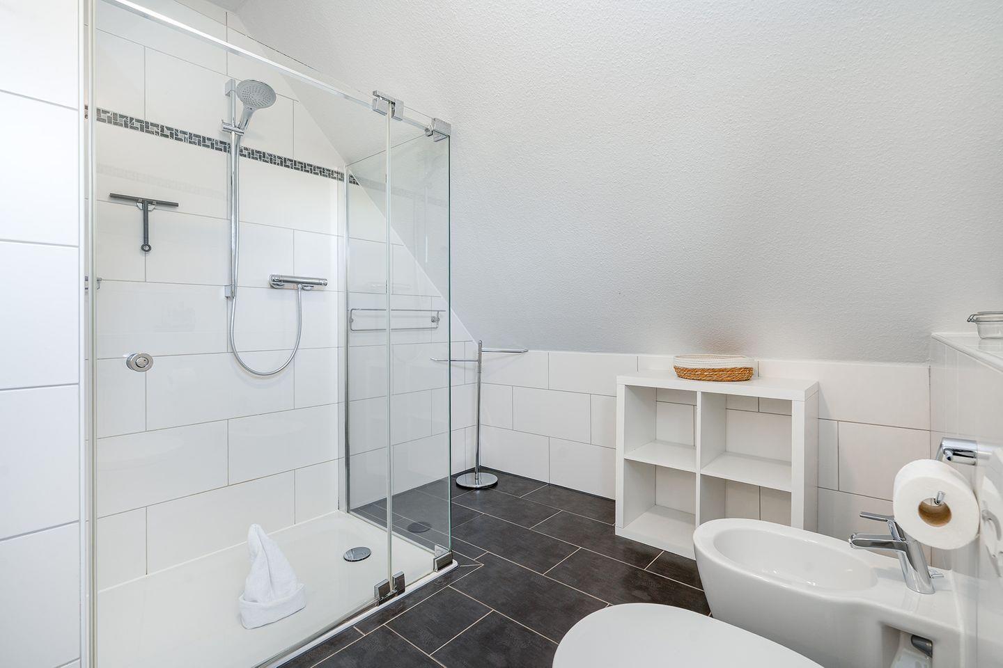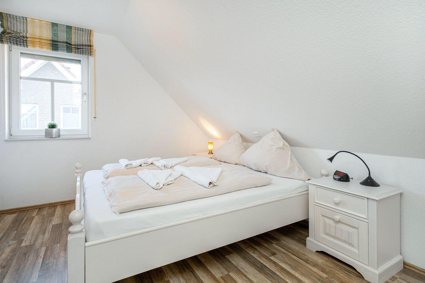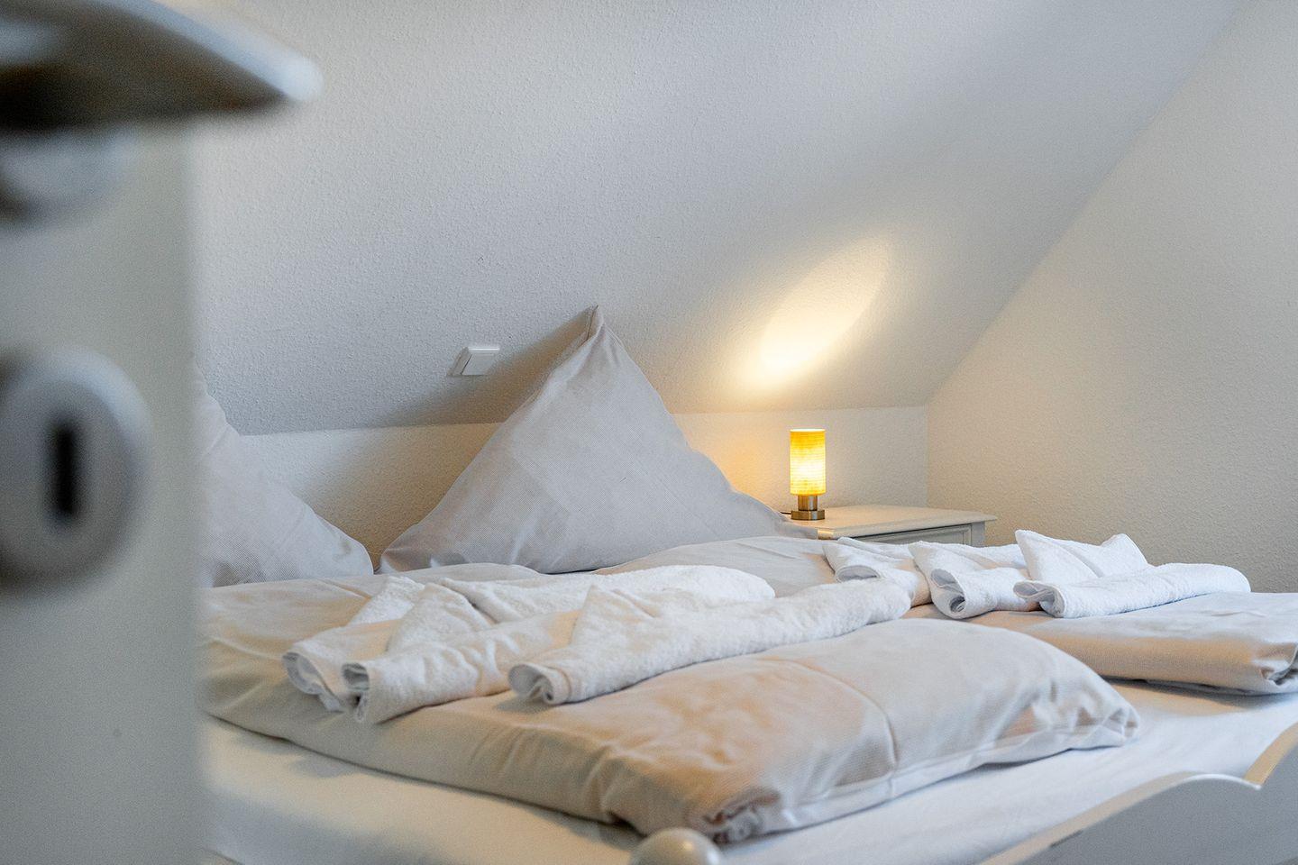 Im Obergeschoss befinden sich 2 Schlafzimmer, jeweils mit Doppelbett und Kleiderschrank eingerichtet, in einem der Schlafzimmer ist auch ein Fernseher angebracht. Das 3. Schlafzimmer bietet Ihnen ein 1,20m breites Bett für die 5. und ggfs. 6. Person, einen Schreibtisch mit Fernseher und DVD-Player und einen Schrank. Zum Februar 2024 wurden für alle Betten neue Wendematratzen (weich/hart) angeschafft. Das Duschbad im OG ist ebenfalls mit einem Fenster zum Lüften ausgestattet.