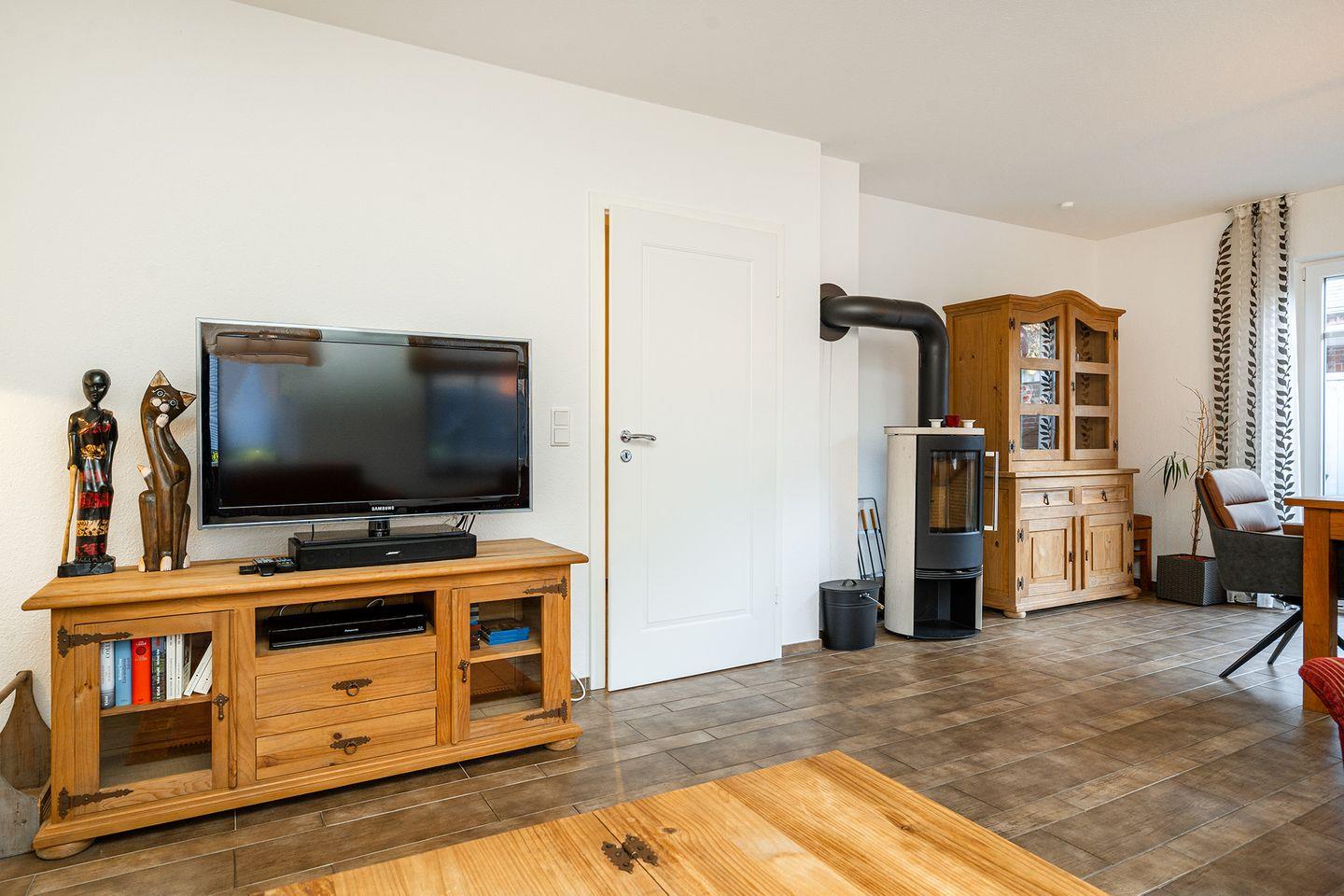 Im Erdgeschoss finden Sie eine großzügige komplett eingerichtete Küche mit allem was das Herz begehrt, wie Geschirrspülmaschine, Kühlschrank mit Gefrierfach, Kaffeemaschine, Toaster, Wasserkocher und Eierkocher. Der Wohn- und Essbereich ist gemütlich eingerichtet mit einem massiven Esstisch aus Pinienholz mit 4 Stühlen und 2 Hockern, einer Eckcouch mit ebenfalls massivem Tisch und einer Fernsehgarnitur mit DVD/Blu-ray-Player und Radio. Ganz neu finden Sie dort nun auch einen Kaminofen für die ungemütlichen Tage im Jahr. Das Duschbad ist modern und neuwertig ausgestattet und hat ein Fenster zum Lüften. Im Abstellraum finden Sie eine Waschmaschine und einen Trockner.