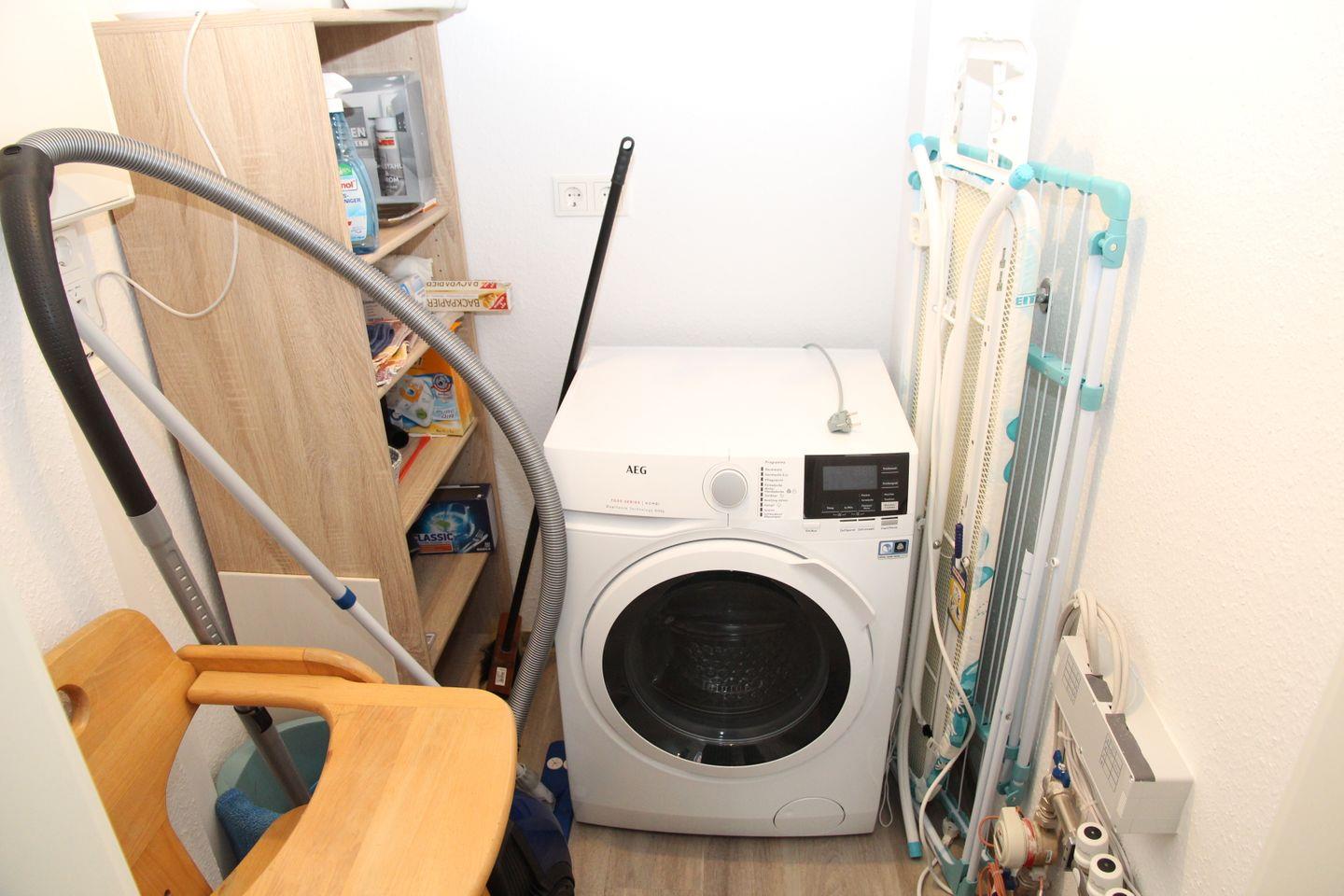 Im Abstellraum befindet sich ein Waschtrockner, ein Wäscheständer und ein Bügelbrett-/eisen.