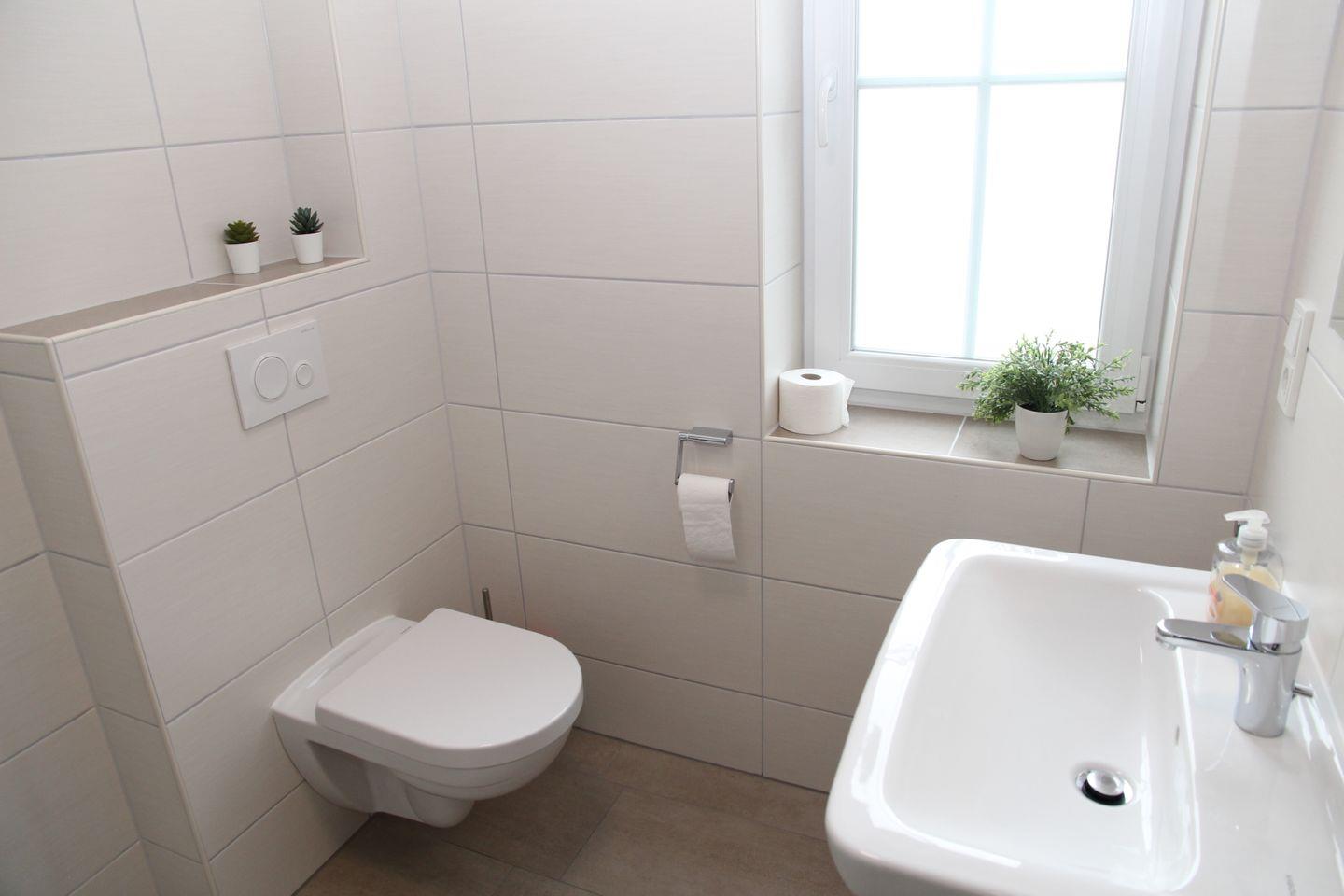 Das Badezimmer mit ebenerdiger Dusche, Toilette und Föhn befindet sich direkt neben dem Gäste-WC.