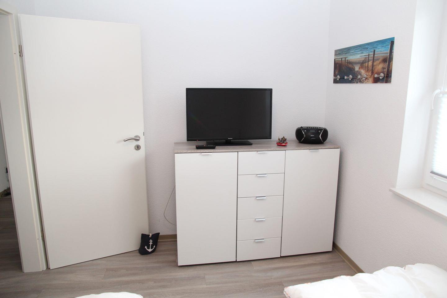 Die Ferienwohnung Sonne und Meer im Erdgeschoss ist geschmackvoll und modern eingerichtet. Sie verfügt über zwei Schlafzimmer, wovon eines mit einem Doppelbett und das andere mit zwei Einzelbetten ausgestattet ist. Beide Schlafräume lassen sich mit elektrischen Außenjalousien abdunkeln. In dem 2. Schlafzimmer befindet sich ein Fernsehgerät.
