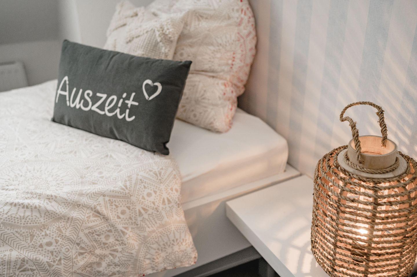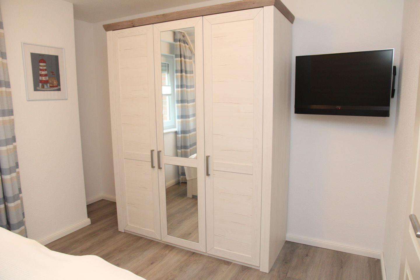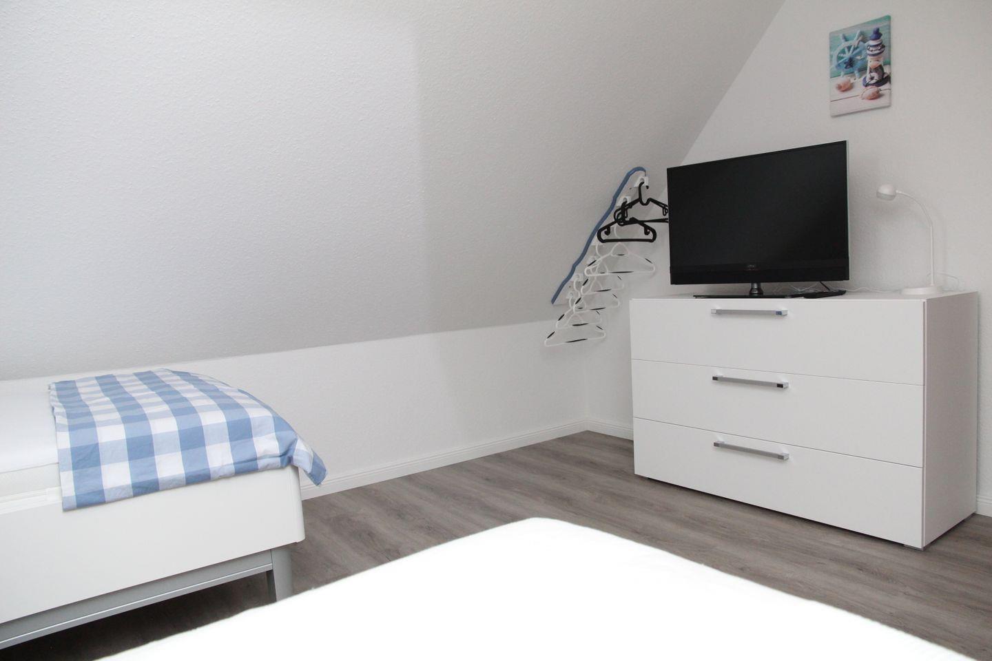 Das Schlafzimmer verfügt über ein Doppelbett (1,80 x 2,00 m), einen Kleiderschrank und einen Wand-Flachbildfernseher. In dem zweiten Schlafzimmer im Dachstudio befinden sich zwei Einzelbetten (0,90 x 2,00 m) sowie eine Kommode und ebenfalls ein Flachbildfernseher. Im Dachstudio ist ein Vorhang zur Verdunkelung des speziellen Bullaugen-Fensters angebracht. Dies verleiht dem Schlafzimmer ein gemütliches Kajütenfeeling. Eine Garderobenvorrichtung zum Aufhängen einiger Kleidungsstücke ist an der Wand angebracht.