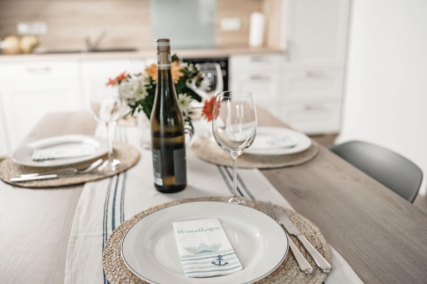 Im gemütlichen Wohnbereich finden Sie ein Friesensofa mit Sessel, Kommode, Flachbild-TV und Radio sowie einen Esstisch mit vier modernen Stühlen. Die hochwertige Küchenzeile bietet für Ihren Aufenthalt eine Kaffeemaschine, Mikrowelle, einen Toaster, Wasserkocher, Herd, Backofen, Kühlschrank (ohne Gefrierfach) und eine Geschirrspülmaschine.