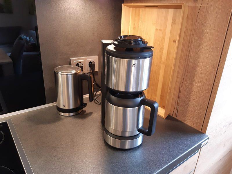 Die moderne Küche ist komplett und hochwertig ausgestattet (Backofen, Cerankochfeld, extragroßer Kühlschrank mit Gefrierfach, Geschirrspülmaschine, Mikrowelle, Philips-Senseo-Padmaschine, Filterkaffeemaschine, Wasserkocher, Toaster, Eierkocher, Teeservice u.v.m.).