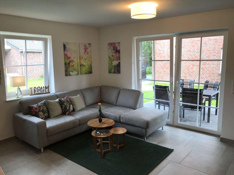 Das Wohnzimmer bietet eine gemütliche und bequeme Eckcouch und einen großen Fernseher (Smart-TV). Das vorhandene Radio ist mit DAB +, einer Bluetooth-Schnittstelle zur Nutzung von Streaming-Diensten über das eigene Smartphone sowie einer WLAN-Schnittstelle zum Empfang von Internet-Radio ausgestattet. Eine umfassende Spiele- und Büchersammlung (u. a. Ostfriesenkrimis) verspricht entspannte Stunden in der Wohnung.