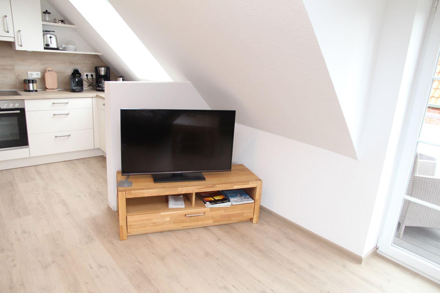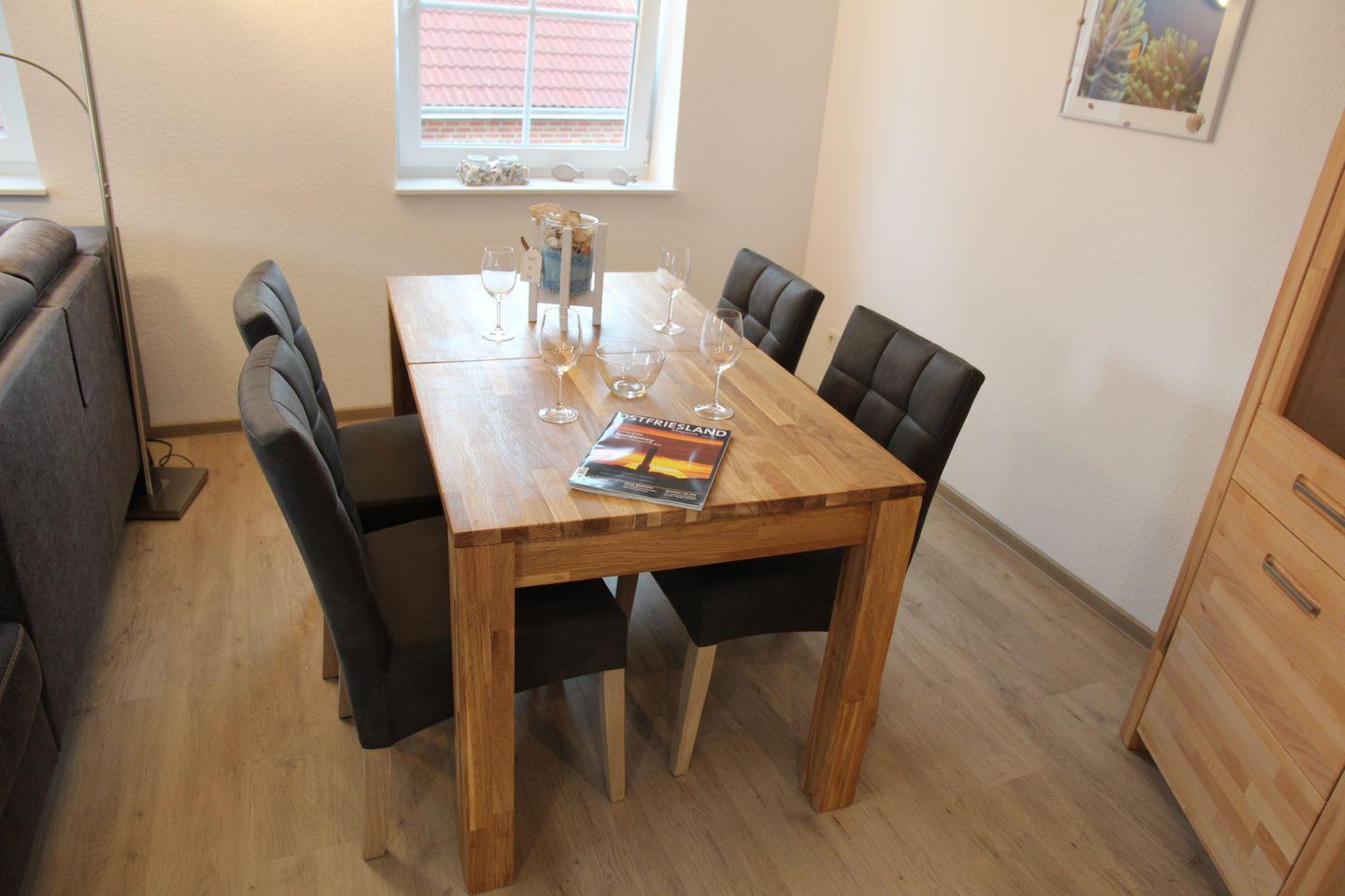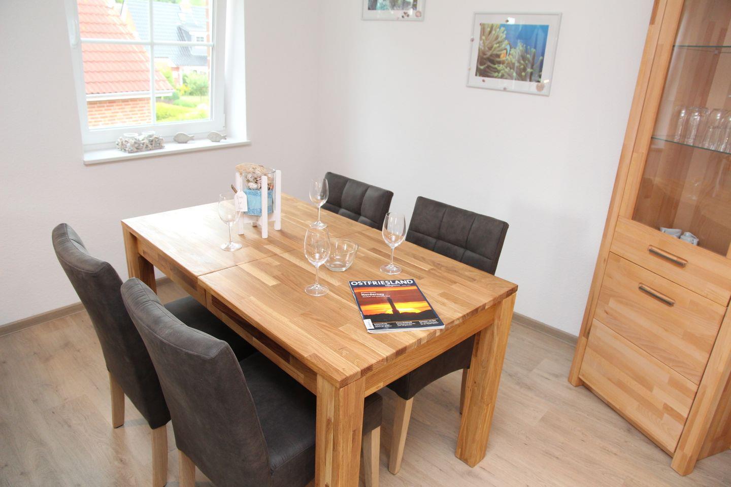 Moderne Obergeschosswohnung in Greetsiel mit Balkon, Fußbodenheizung und WLAN, ideal für einen entspannten Urlaub an der Nordsee.