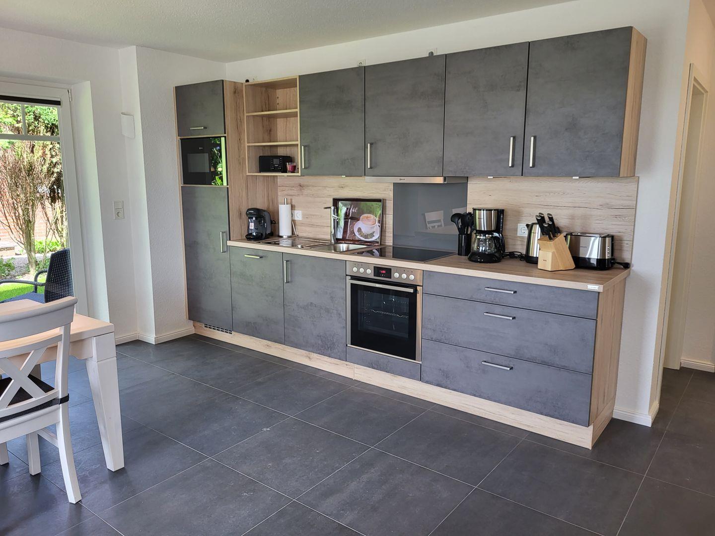 Der Wohnbereich ist mit einem gemütlichen L-Sofa, Sessel und großem Flachbildfernseher ausgestattet, ebenfalls finden Sie hier den Esstisch mit vier Stühlen und die Einbauküche. Die Küche verfügt über alle essentiellen Geräte, wie bspw. einen Kühlschrank mit Gefrierfach, Backofen, Ceran-Kochfeld, Mikrowelle, Kaffeemaschine, Bosch-Kapselmaschine, Toaster, Wasserkocher etc.. Auch ein Küchenradio ist vorhanden.