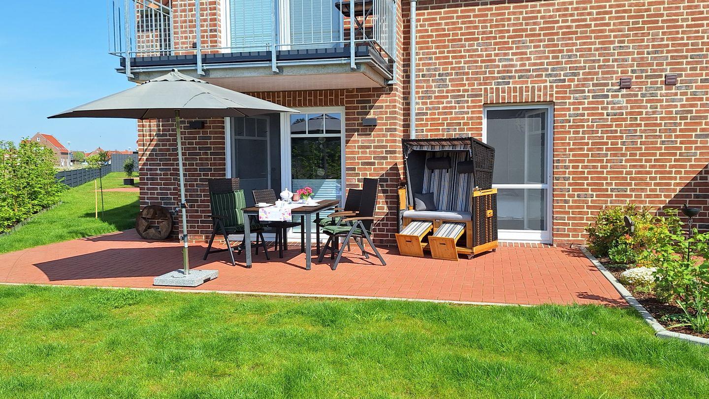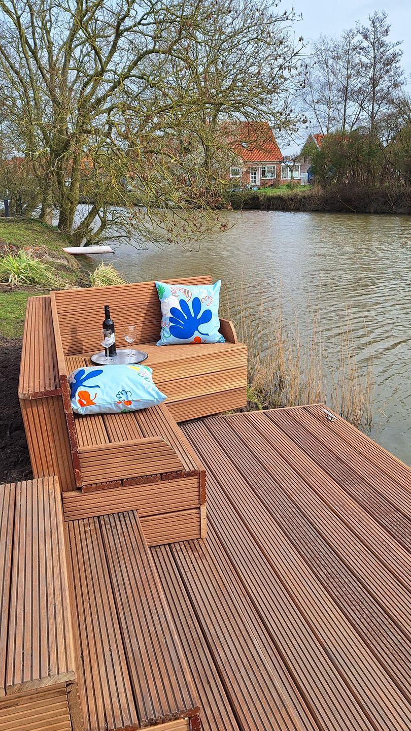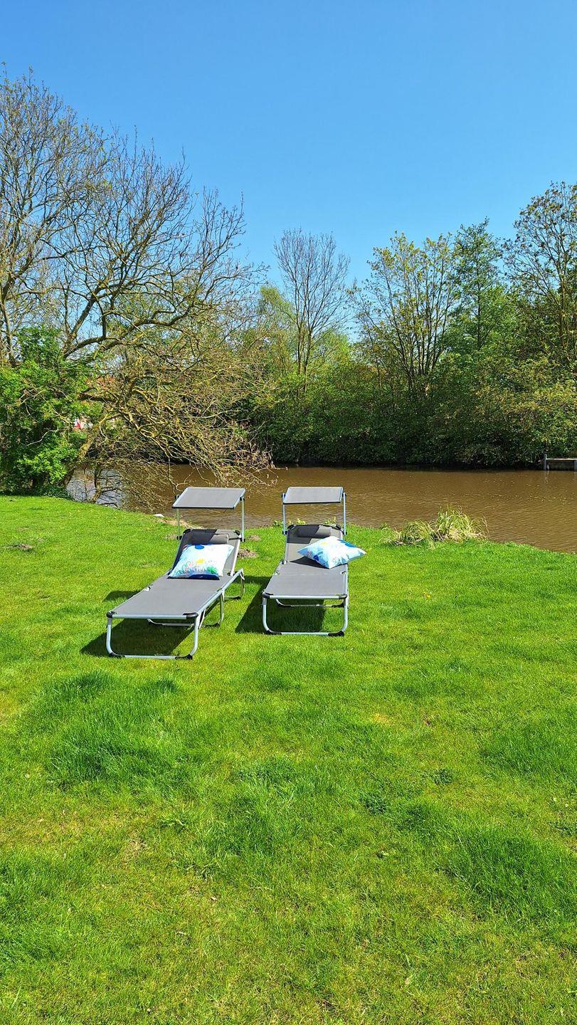 Der freie Blick auf den grünen Garten mit Grachtenzugang verspricht Urlaubsflair pur. Ostfriesisches Grachtenkino bietet dabei die direkt an den Wohnbereich angrenzende 25 m² große Terrasse, die ganztags wärmende Sonnenstrahlen verspricht. Gartenmöbel, Strandkorb und Elektrogrill sind vorhanden.