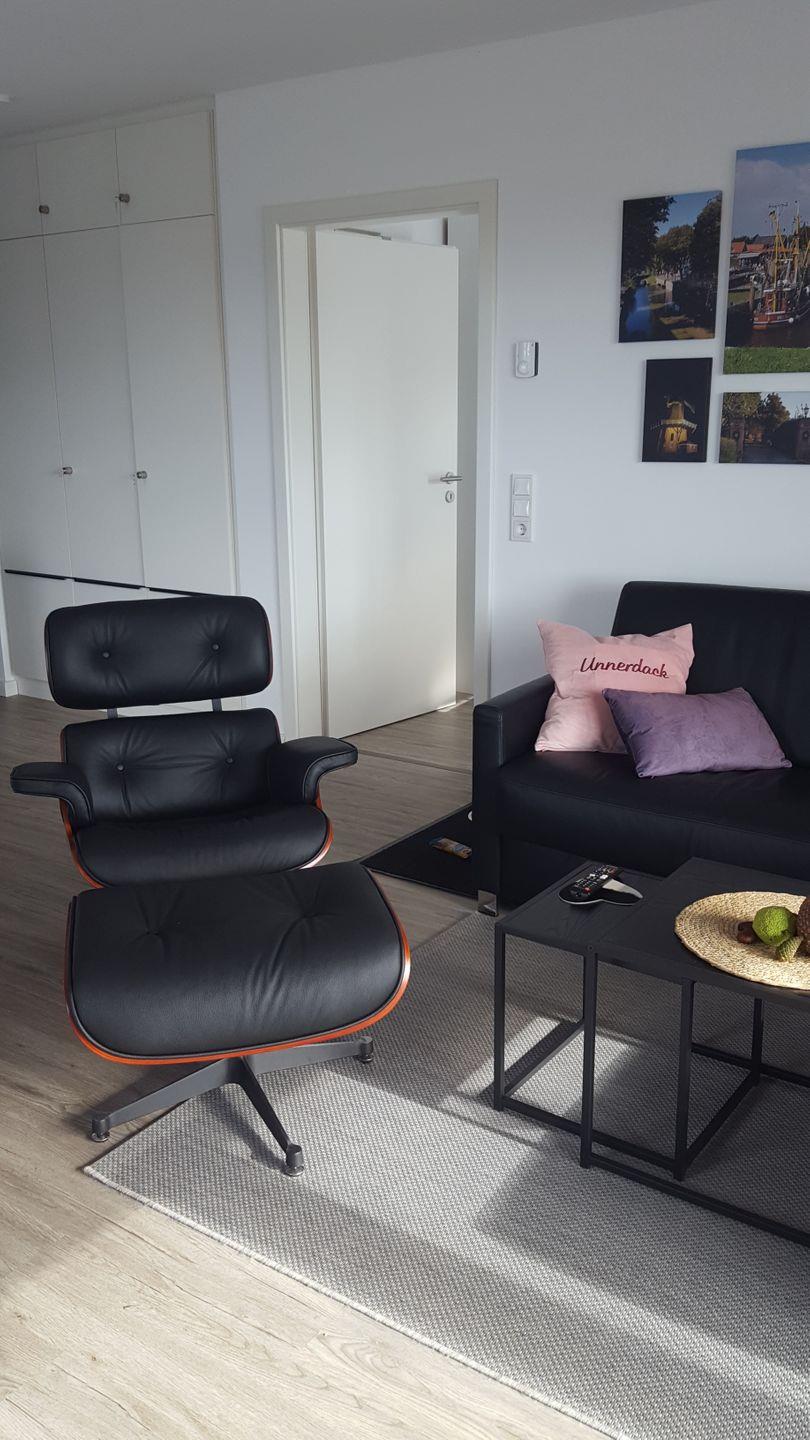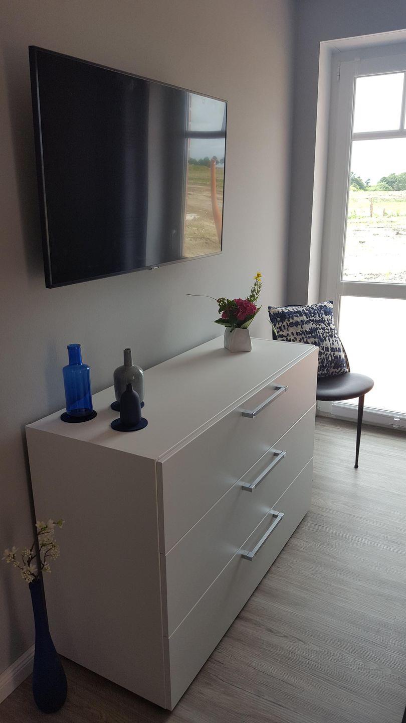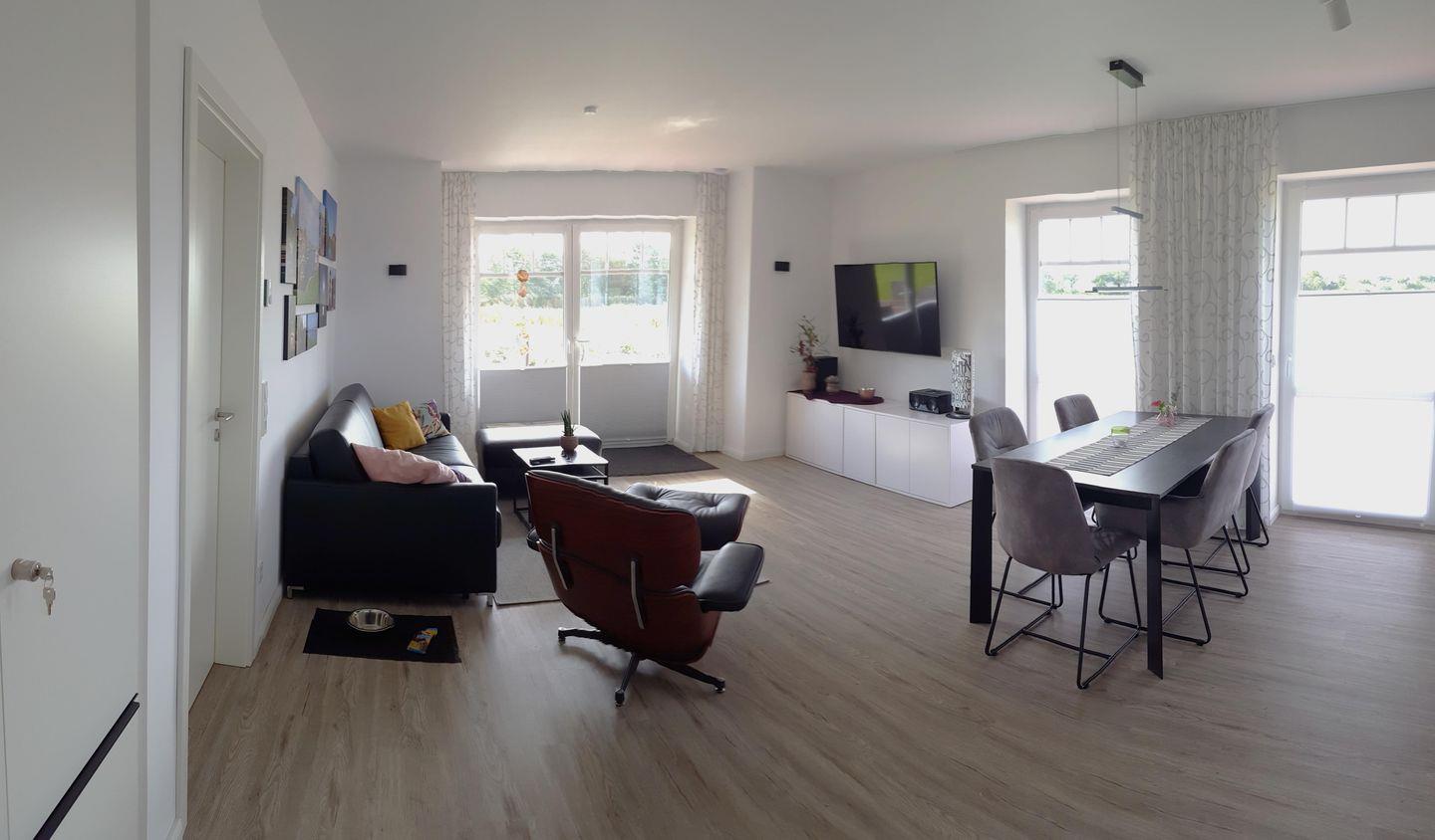 Der offen gestaltete Wohn- und Essbereich mit seinen bodentiefen Fenstern bildet den Mittelpunkt der Ferienwohnung. Ob bei gemeinsamen Mahlzeiten, unterhaltsamen Fernsehstunden (55 Zoll-Flatscreen) oder lustigen Spieleabenden, am Esstisch mit 5 Stühlen oder auf dem bequemen 3-Sitzer-Ledersofa und dem wohl geschwungenen Ledersessel mit Ottomane ist genügend Platz.