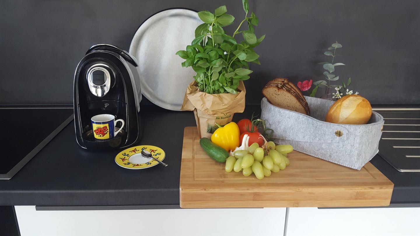Weitere Ausstattungsmerkmale der Wohnung: Kühlschrank mit Gefrierfach, Spülmaschine, Cerankochfeld, Backofen, Mikrowelle, Filter-Kaffeemaschine, Kaffeekapselmaschine, Wasserkocher, Toaster, Mixer, Pürierstab, Waschtrockner, Bügelbrett, Bügeleisen, Wäscheständer, Staubsauger, Haarföhn, Fliegengitter an allen Fenstern, Gesellschaftsspiele und Bücher sowie vieles mehr.