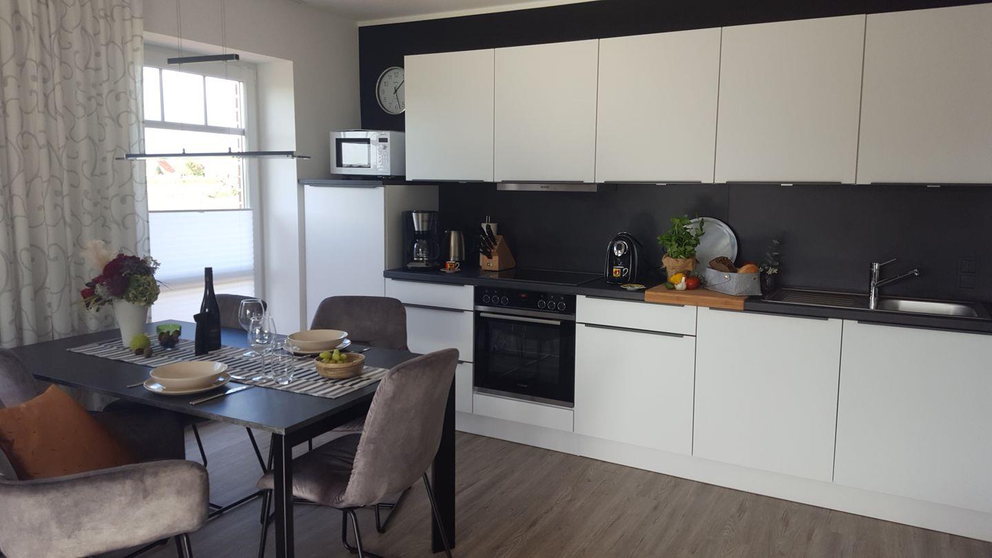 Die offene helle Küche bietet eine qualitativ ausgewählte Vollausstattung und lässt keine Wünsche offen. An der Giebelseite des Hauses befindet sich eine weitere Terrasse. Hier können Sie Ihr Frühstück in Ruhe genießen und haben nur einen Schritt in die Küche.