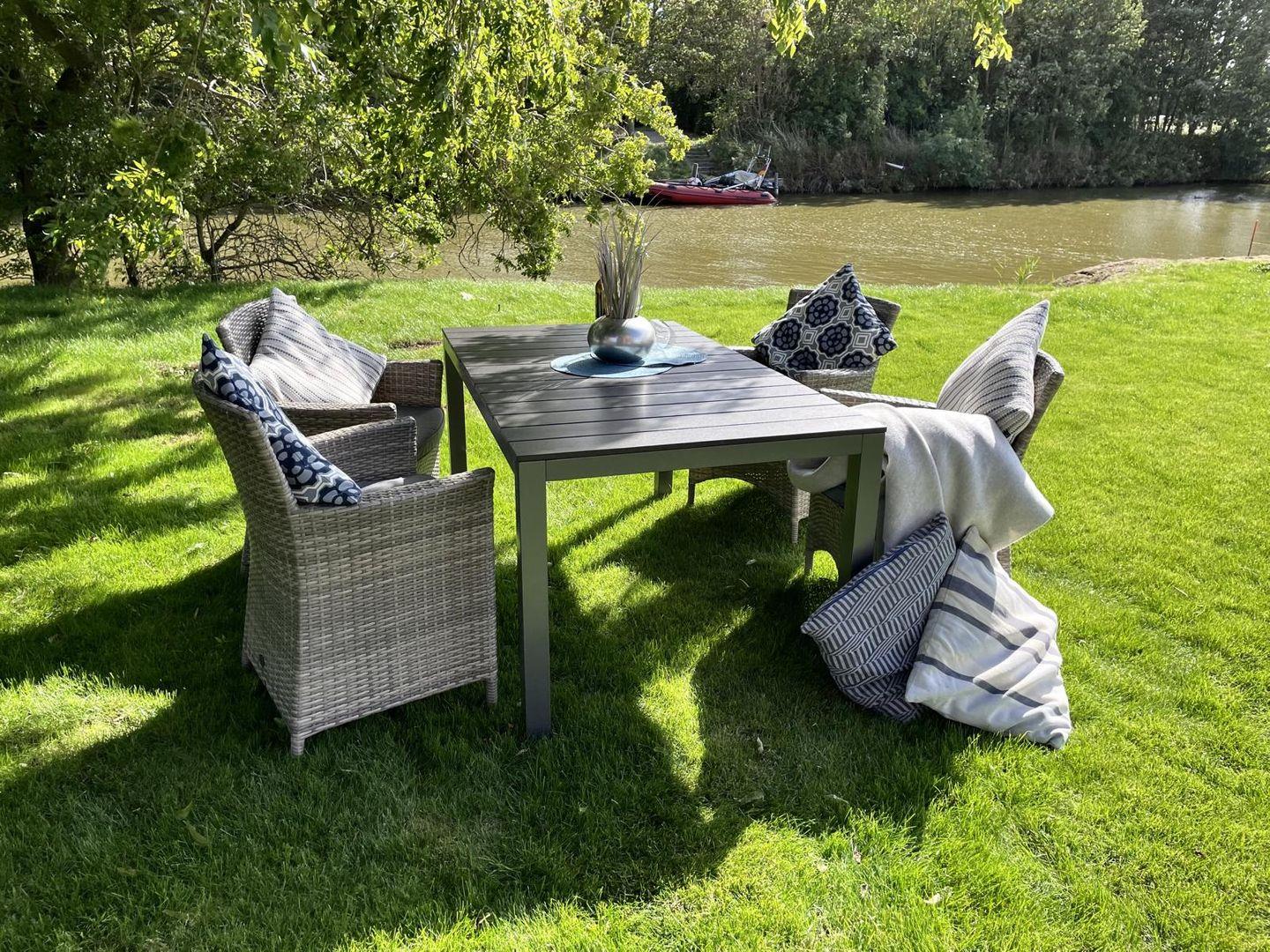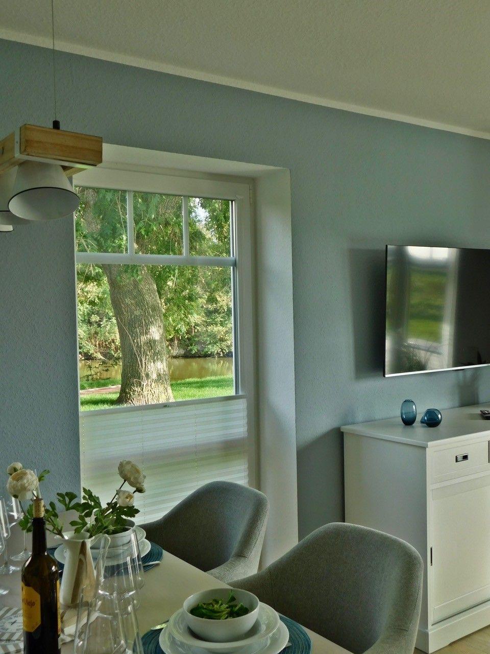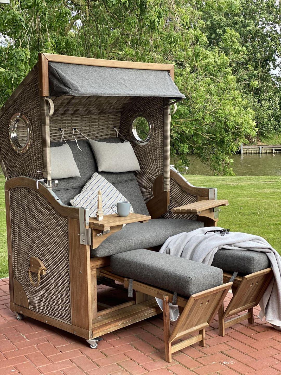 Grachtentied besticht durch einen gemütlichen Wohn-Essbereich, der zum Verweilen einlädt. Die farblich aufeinander abgestimmten und maritim anmutenden Einrichtungselemente lassen sofort Gemütlichkeit aufkommen. Durch die bodentiefen Fenster in der gesamten Wohnung entsteht eine lichtdurchflutete, warme Atmosphäre. Privatsphäre ist durch die an allen Fenstern vorhandenen Plissees möglich. Weiterhin sind alle Fenster mit Insektenschutz ausgestattet. Die große Süd-Terrasse mit den hochwertigen Gartenmöbeln lädt zum Entspannen und Verweilen ein. Hier lassen sich bei einer Tasse Tee oder einem Glas Wein herrliche Abende verbringen und die vorbeifahrenden Boote beobachten. Die Wohnung verfügt zudem über einen großzügigen Garten. Ergänzend steht Ihnen pünktlich zu den Osterferien ein sehr hochwertiger und gemütlicher Strandkorb zur Verfügung, indem Sie geschützt auch an etwas windigeren Tagen die Sonnenstrahlen einfangen und genießen können.