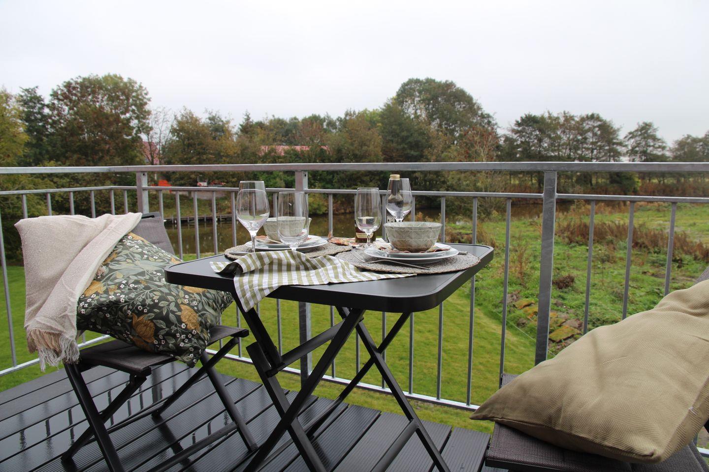 Moderne Obergeschoss-Ferienwohnung in Greetsiel mit Balkon, Kamin und Blick aufs Wasser.