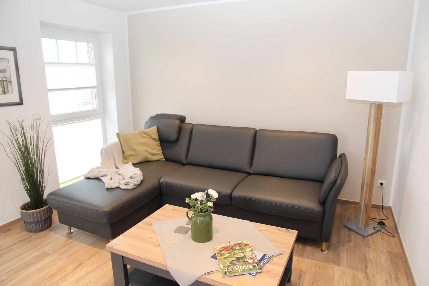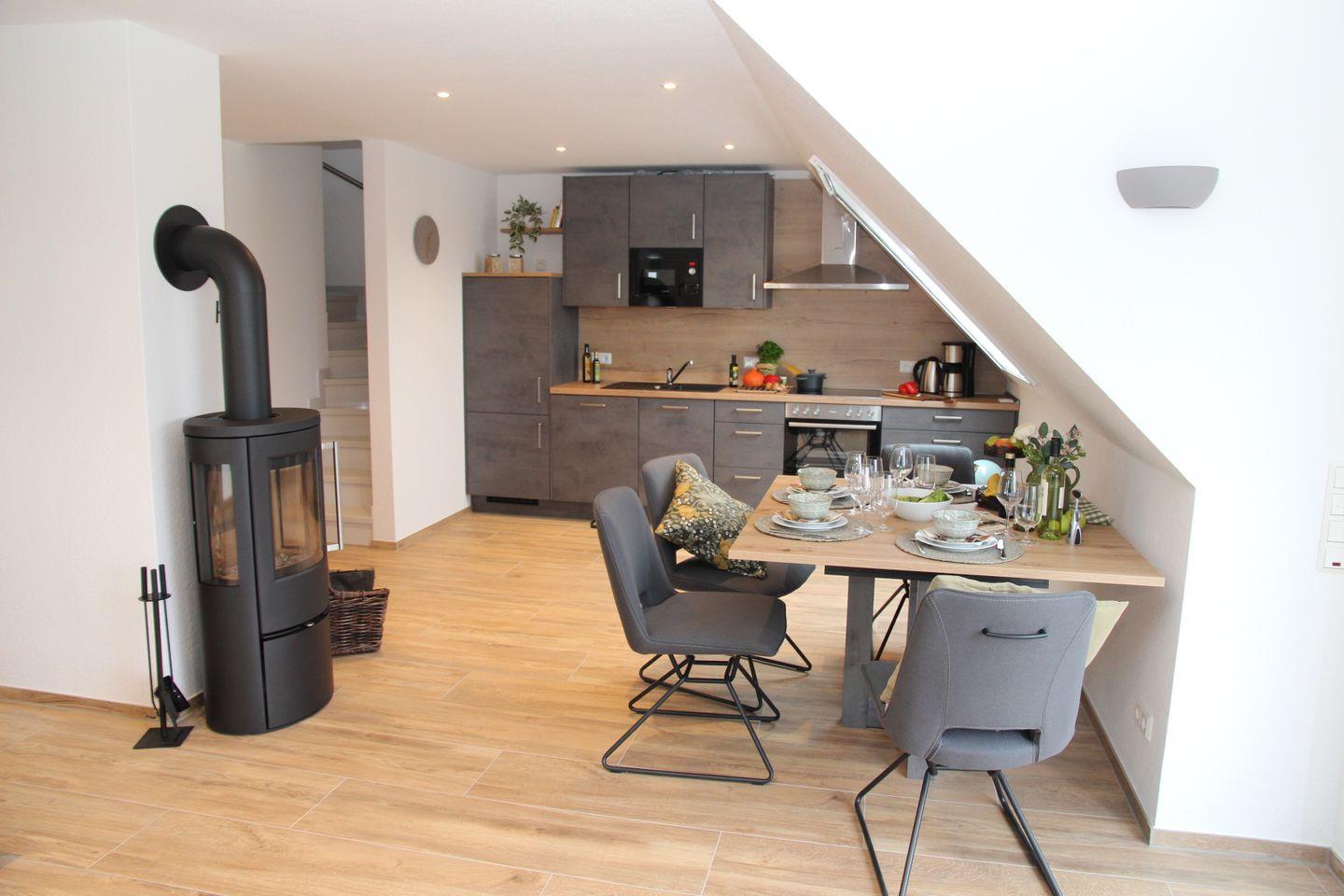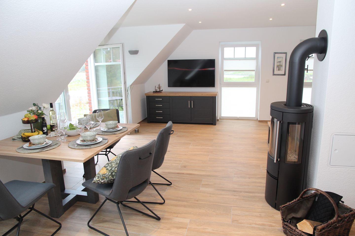 Hier werden Sie sich wohlfühlen: Sie betreten diese tolle Wohnung durch den Hausflur und landen dann direkt in der voll ausgestatteten Küche (Spülmaschine, Cerankochfeld, Backofen, Kühlschrank mit Gefrierfach, Kaffeemaschine, Toaster, Wasserkocher etc.). Angrenzend finden Sie den Esstisch mit vier gemütlichen Sitzsesseln und den Wohnbereich mit L-Sofa, großem Smart-TV und einem Sessel. Auch ein Kaminofen, der von Küche bis Sofa eingesehen werden kann, ist vorhanden. Vom Wohnbereich können Sie auch auf den möblierten Balkon mit wunderschönem Blick auf das Greetsieler Sieltief hinaustreten.