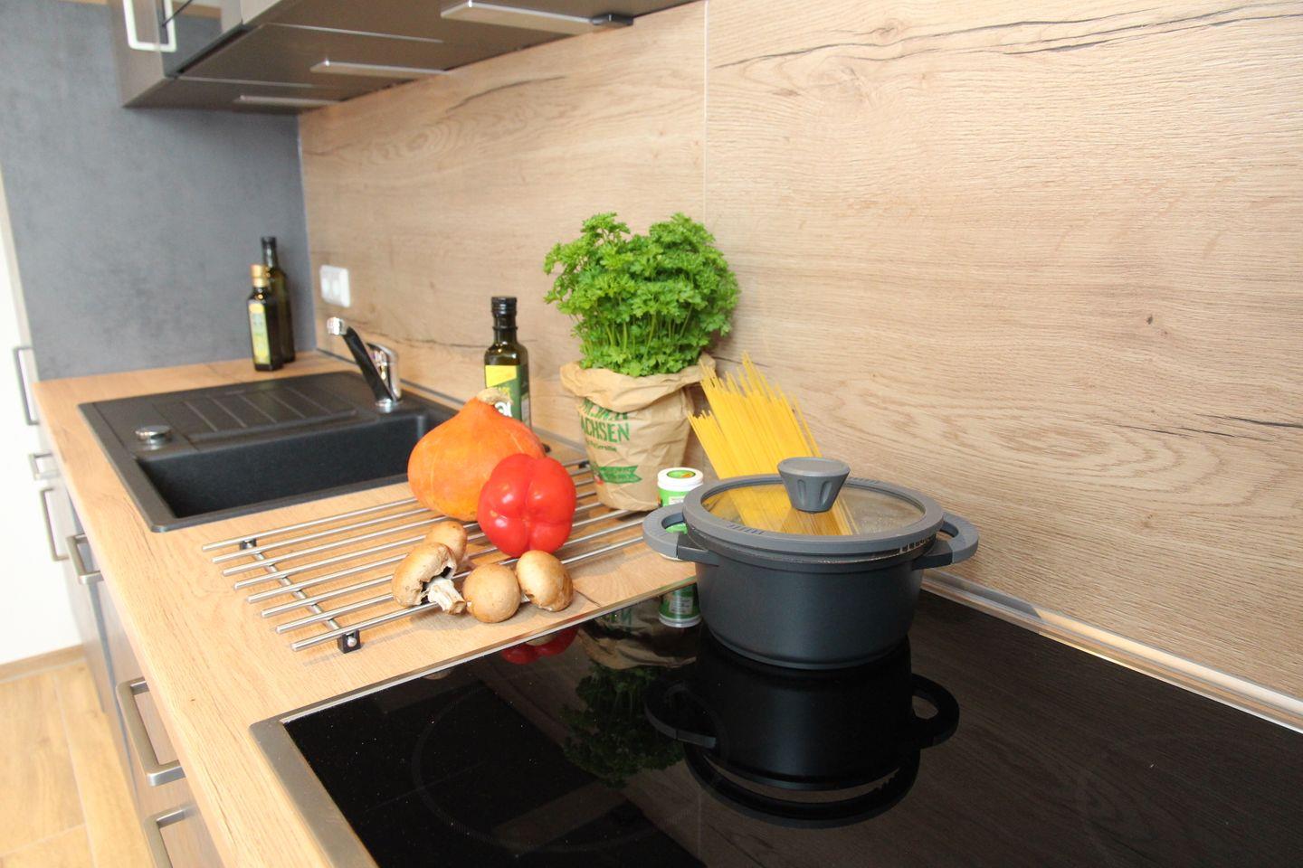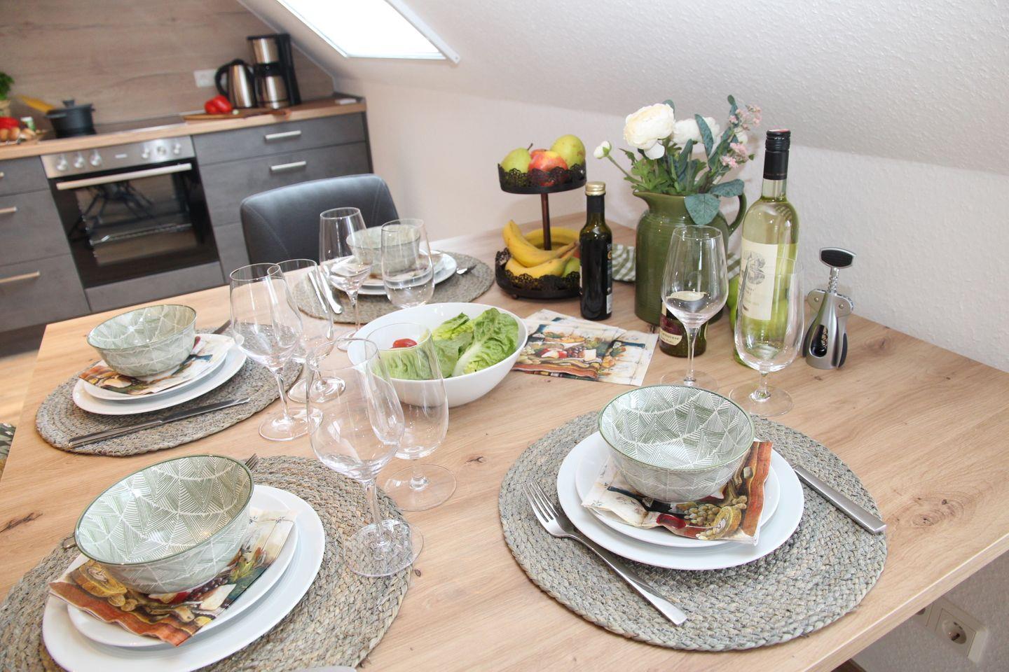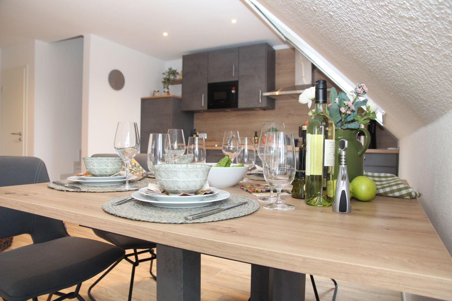 Hier werden Sie sich wohlfühlen: Sie betreten diese tolle Wohnung durch den Hausflur und landen dann direkt in der voll ausgestatteten Küche (Spülmaschine, Cerankochfeld, Backofen, Kühlschrank mit Gefrierfach, Kaffeemaschine, Toaster, Wasserkocher etc.). Angrenzend finden Sie den Esstisch mit vier gemütlichen Sitzsesseln und den Wohnbereich mit L-Sofa, großem Smart-TV und einem Sessel. Auch ein Kaminofen, der von Küche bis Sofa eingesehen werden kann, ist vorhanden. Vom Wohnbereich können Sie auch auf den möblierten Balkon mit wunderschönem Blick auf das Greetsieler Sieltief hinaustreten.