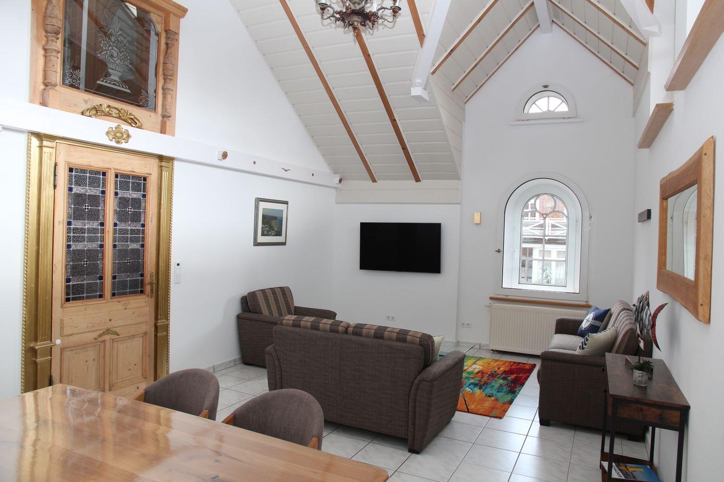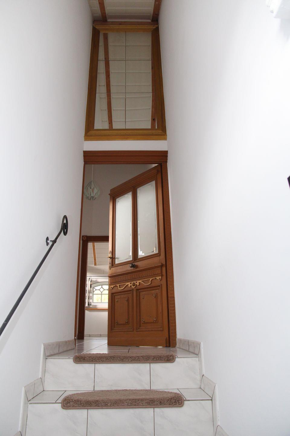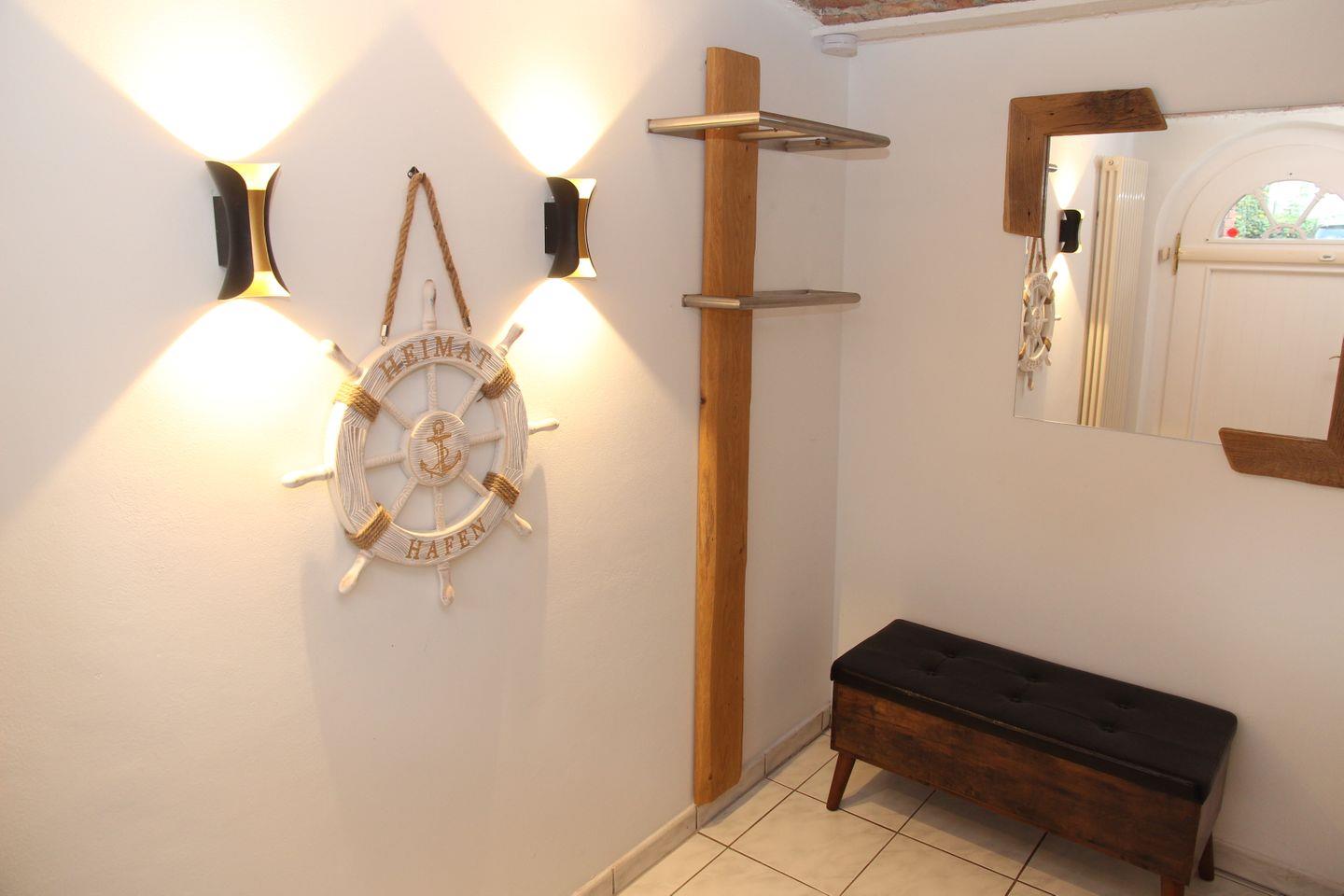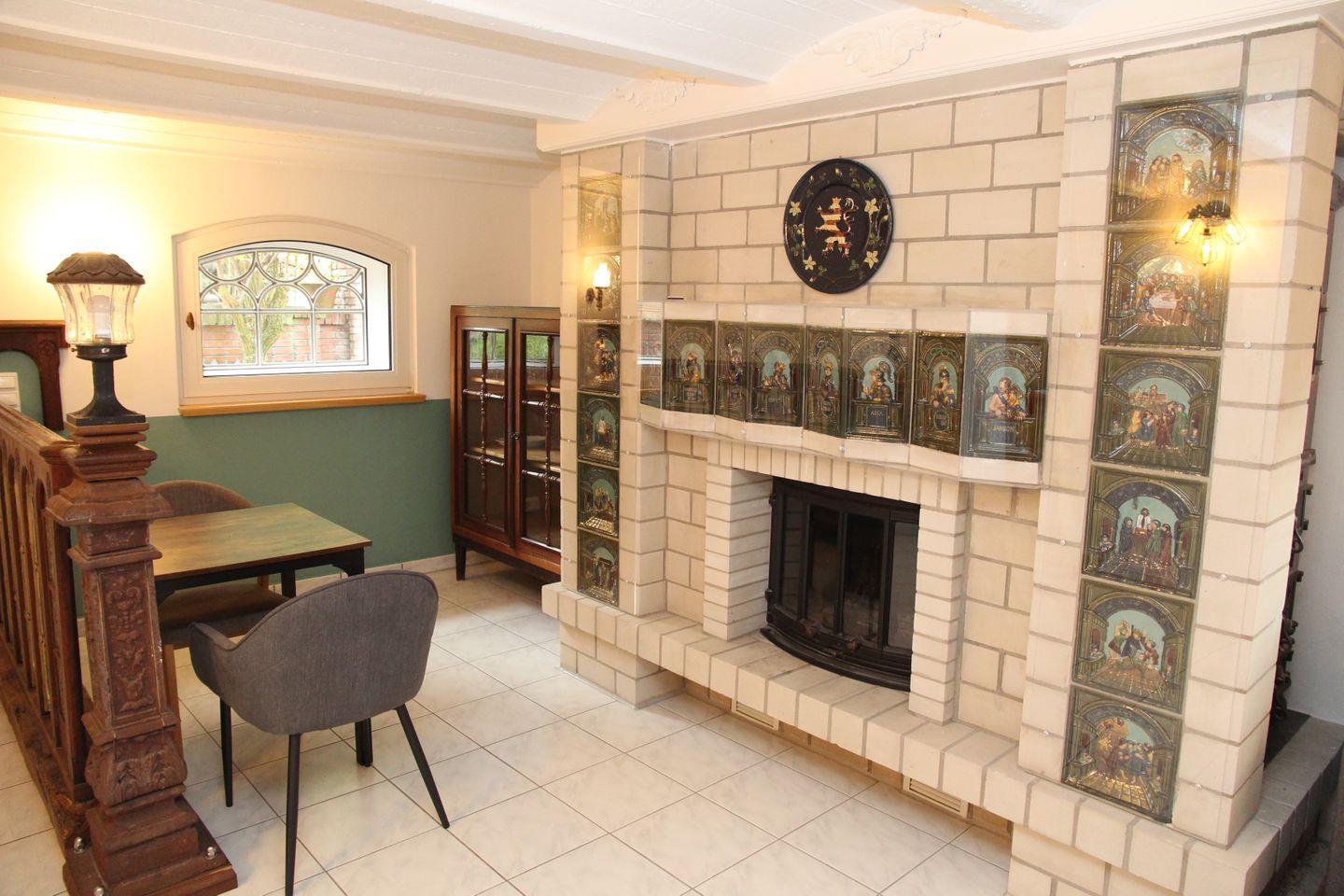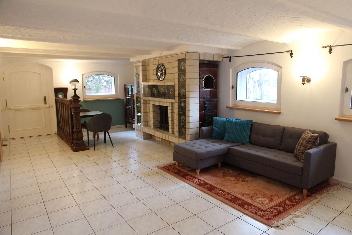 Betreten Sie das Haus durch die weiße Eingangstür in die große Garderobe im Eingangsbereich. Von dort aus gelangen Sie in den Wohnbereich im Erdgeschoss, wo Sie einen großen Flachbildfernseher, ein L-Sofa und einen Sitzplatz für 2 Personen vorfinden. Hier ist ebenfalls ein historischer Kaminofen vorhanden, der allerdings aus Brandschutzgründen nicht genutzt werden darf.