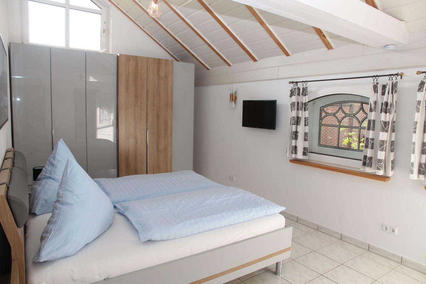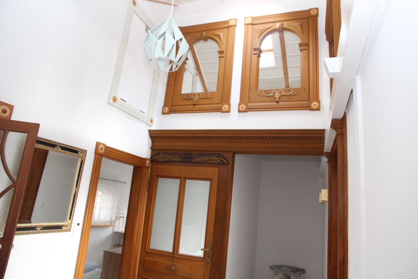 Im Obergeschoss landen Sie in einem schönen Flur mit hoher Decke, von dem alle weiteren Räume mit hochwertigen und historischen Türen abgehen. Dort befindet sich zum einen der zweite Wohnbereich mit zwei Sofas, einem Sessel, Couchtisch, großem Flachbildfernseher und einem Esstisch mit vier Stühlen. Dieser Raum ist durch zahlreiche Fenster und eine tolle Deckenhöhe angenehm hell. Im nächsten Raum befindet sich ein Schlafzimmer mit Doppelbett, großem Kleiderschrank und TV. Von hier aus geht auch das zweite Badezimmer in historischem und besonderem Stil ab: Doppelwaschbecken, riesiger Spiegel, stehende Badewanne und WC.