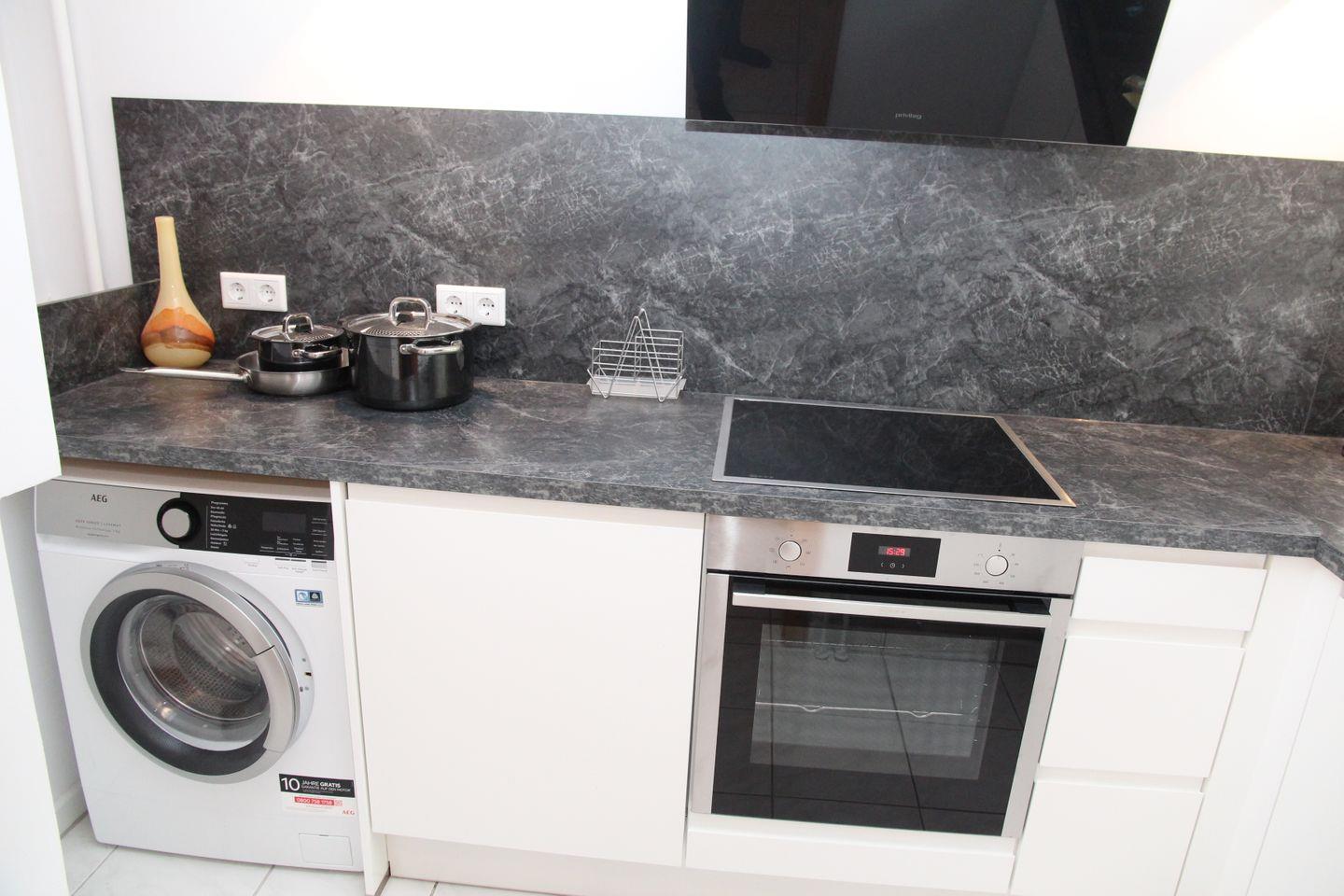 Vom Wohnbereich gehen drei weitere Räume ab: Zum einen die erste nahezu komplett ausgestattete Küche mit integrierter Waschmaschine, weiterhin ein Schlafzimmer mit einem Einzelbett und ein vollwertiges Duschbad.
