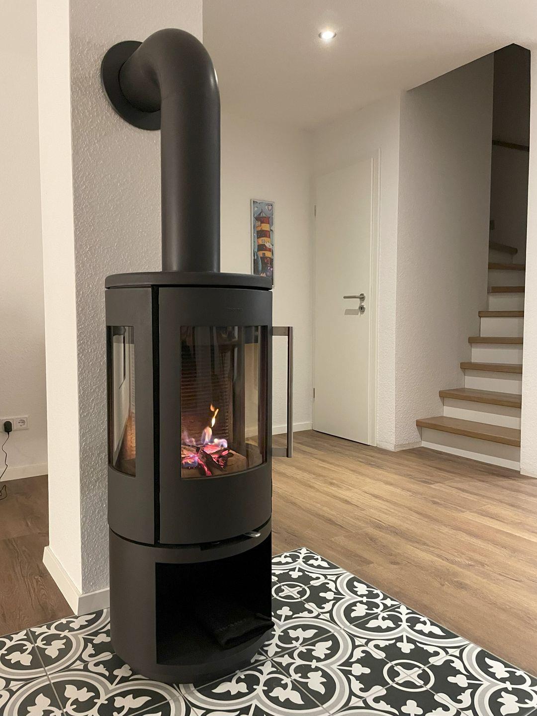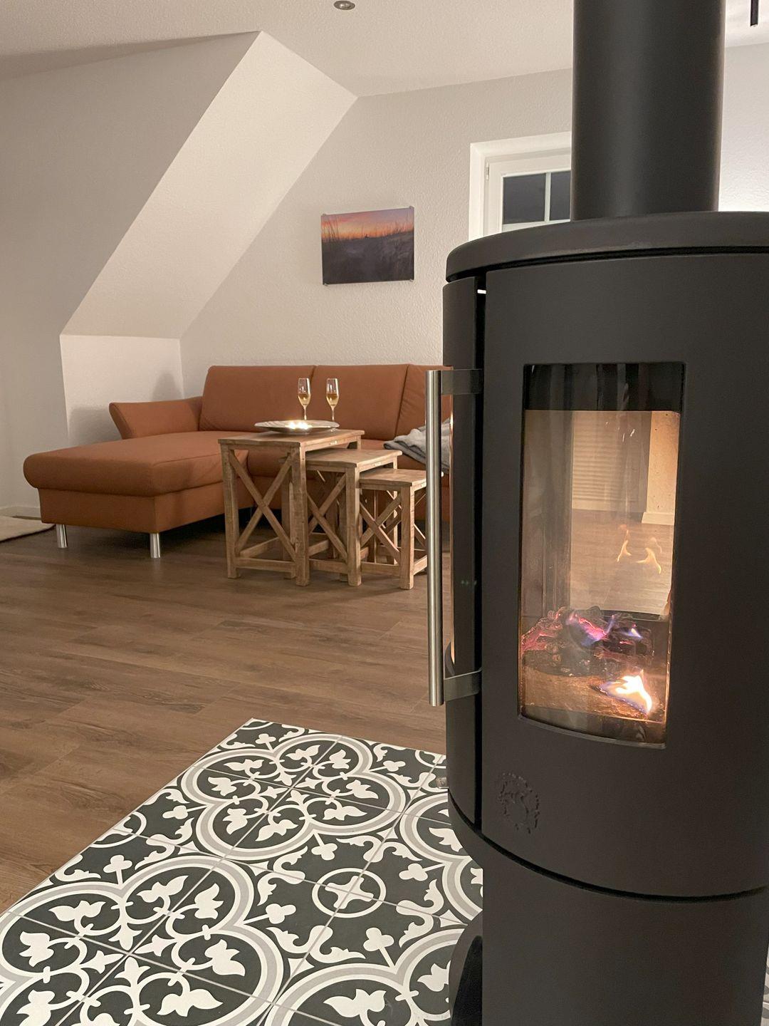Der großzügige Wohn-, Ess- und Küchenbereich verfügt über einen Kaminofen. Dieser ist vom gemütlichen L-Sofa, dem Esstisch und der Küche einsehbar. Im Wohnzimmer ist ein großer Flachbildschirm installiert. Vom Wohn- und Essbereich kommen Sie auf den möblierten Balkon.