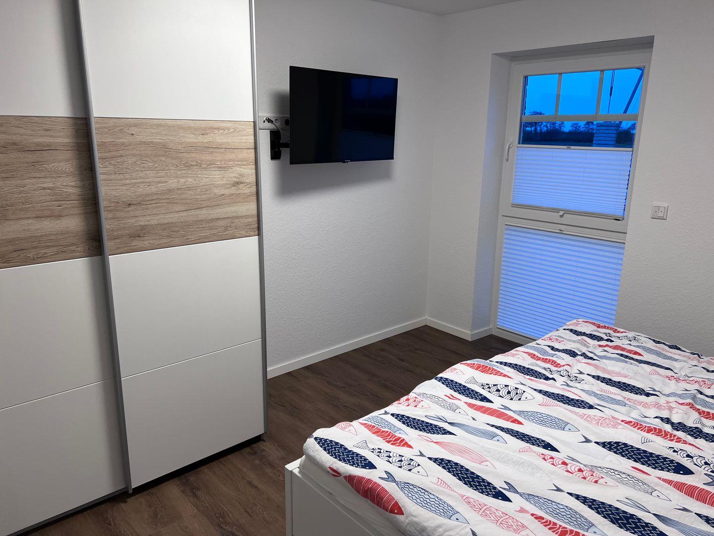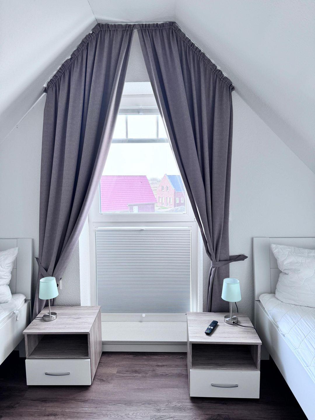 Im Dachgeschoss ist hinter einer verschließbaren Tür ein weiteres Schlafzimmer mit 2 Einzelbetten, Kommode und weiterem Fernseher eingerichtet. Ein Heizkörper ist im Schlafzimmer installiert.