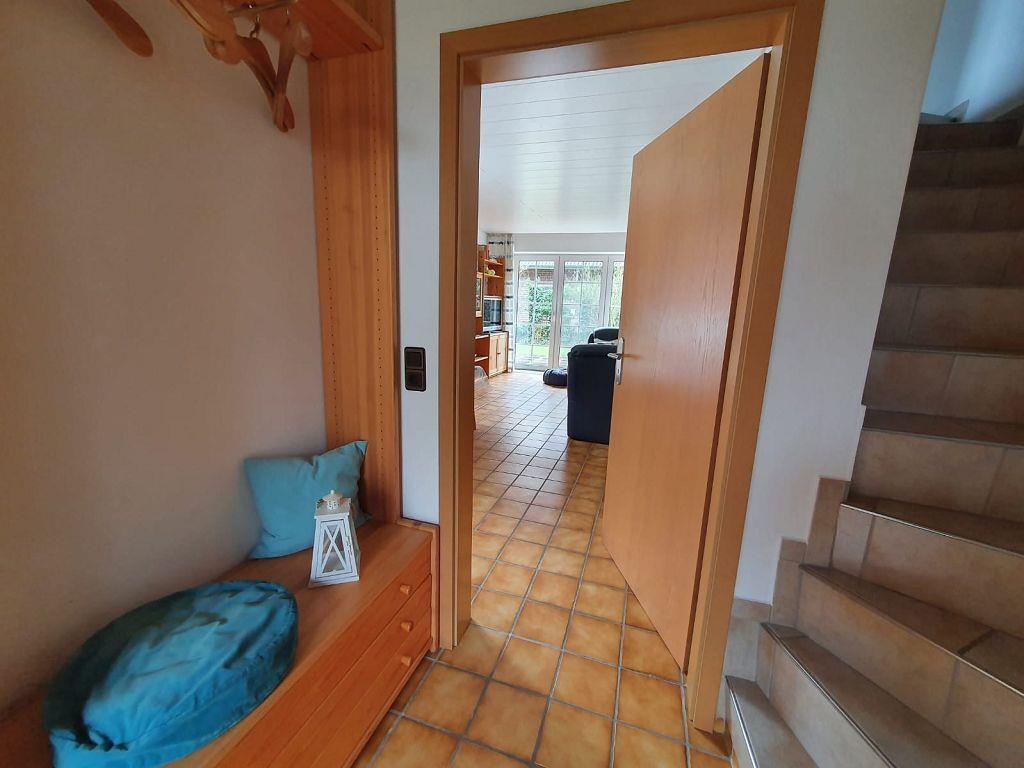 Kommen Sie herein in den hellen Wohnbereich mit Blick auf die Terrasse! Eine große Couchecke mit Flachbild-TV rundet Ihren gemütlichen Urlaub ab. Im Essbereich am Fenster können Sie Ihre Lieblingsmahlzeiten genießen, die Sie in der separaten, gut ausgestatteten Küche mit Geschirrspüler zubereitet haben. Ein Gäste-WC und ein Abstellraum komplettieren das Erdgeschoss.
