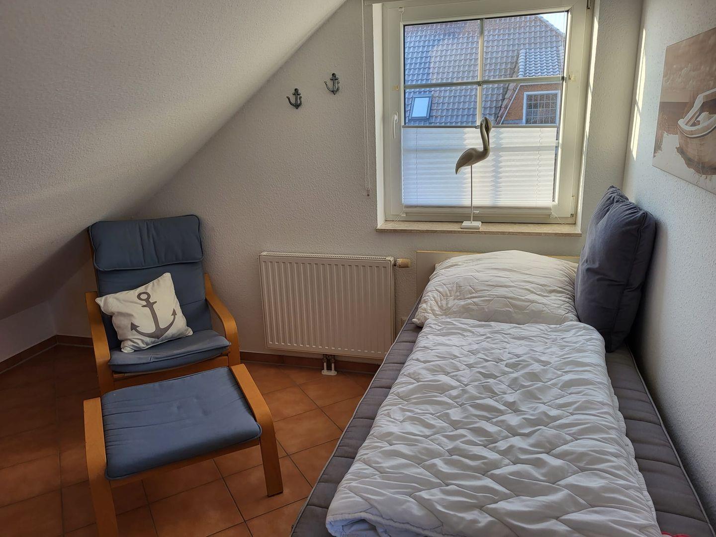 Das Ferienhaus Diekkieker liegt in direkter Lage am Deich mit seinen unbegrenzten Spazierwegen. Die geräumige Ferienwohnung "De Groode Diekkieker" ist mit 3 Schlafzimmern für bis zu 5 Personen ausgestattet. Kommen Sie herein in die gemütlich eingerichtete Wohnung. Die vielen maritimen Details laden zum Wohlfühlen ein. Der Wohn-Essbereich befindet sich im Parterre. Genießen Sie gemütliche Stunden auf der Couch. Ein Flachbild-TV ist vorhanden. Nebenan können Sie am großen Esstisch mit der ganzen Familie zusammen essen oder klönen. Von dort gelangen Sie auf die möblierte Terrasse. Dort können Sie sich die frische Nordseeluft um die Nase wehen lassen. Die Küche hat alles, was ein Hobbykoch so braucht. Die Schlafräume sowie das Bad liegen im Obergeschoß. Das erste Schlafzimmer ist mit einem Doppelbett (160 x 200 cm, großes Laken erforderlich) ausgestattet. Im zweiten Schlafraum steht ein Doppelbett (140 x 200 cm, großes Laken erforderlich). Im 3. Schlafzimmer kann in einem Einzelbett geträumt werden. Das helle Bad verfügt u.a. über eine Badewanne mit Brause/Dusche. Das Ferienhaus Diekkieker kann auf Anfrage auch komplett für 7 Personen (große und kleine Wohnung) zu entsprechenden Preisen gebucht werden. Der Parkplatz liegt direkt vor der Tür. WLAN ist verfügbar.