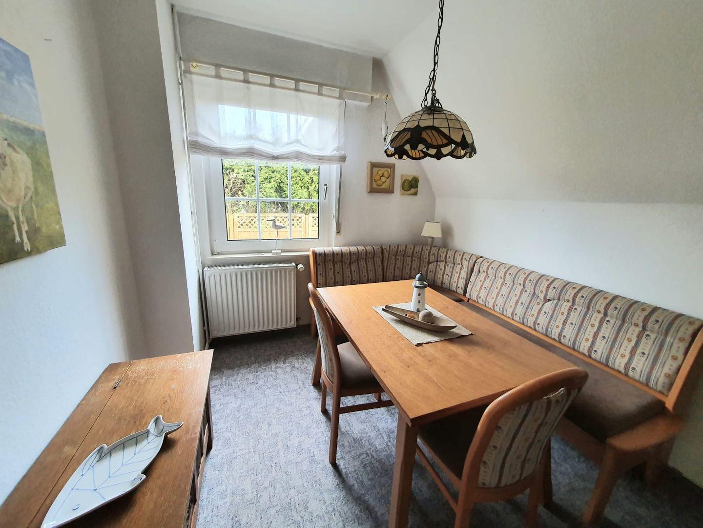 Das Ferienhaus Friesia ist ein Nurdachhaus mit großem Grundstück und liegt in einer ruhigen Sackgassenlage Greetsiels in Deichnähe. Kommen Sie herein! Gleich neben der Haustür befindet sich das Duschbad mit WC, das hell gefliest ist. Der Flur führt Sie in die separate Küche, die komplett eingerichtet ist. Mikrowelle, Kaffeemaschine und Toaster sind vorhanden. Hier können Sie Ihre Speisen zubereiten und dann gegenüber im Esszimmer servieren. Die gemütliche Eckbank lädt ebenfalls zum Klönen und Verweilen ein. Im ganzen Haus hat sich die Eigentümerin mit schönen selbst gemalten Bildern verwirklicht. Geradeaus geht es in den großzügigen Wohnbereich mit Couchgarnitur und Flachbild-TV. Ein Kaminofen im Raum sorgt für ein gemütliches Ambiente. Die große Fensterfront lässt auf die Terrasse blicken. Dort genießt man die frische Luft und die Sonnenstrahlen. Eine etwas steile Raumspartreppe führt nach oben zu 2 Schlafräumen und zum separaten WC. Das erste Schlafzimmer verfügt über ein Doppelbett sowie eine Waschgelegenheit. Gegenüber gelangen Sie in das 2. Schlafzimmer mit 2 Einzelbetten. Die Fenster im unteren Bereich sind mit Außenrollos ausgestattet. Ein Gartenhäuschen steht zum Abstellen von Fahrrädern usw. zur Verfügung. Das Haus Friesia ist ein Nichtraucherhaus! WLAN ist verfügbar!