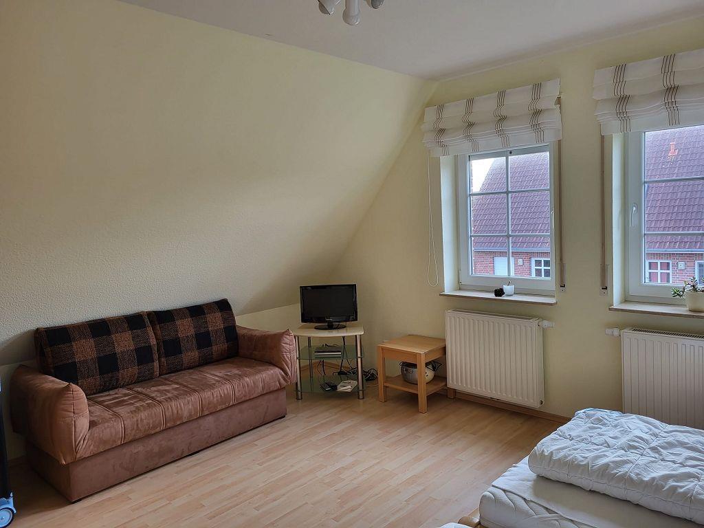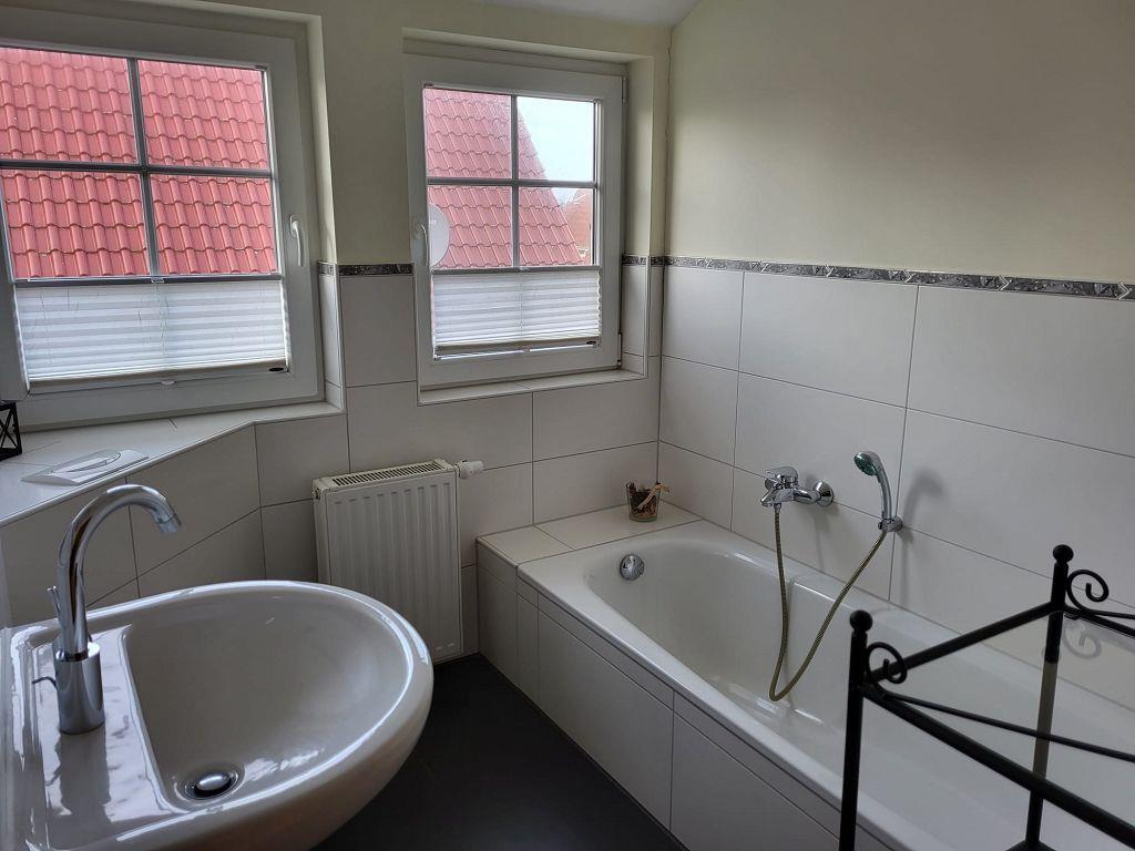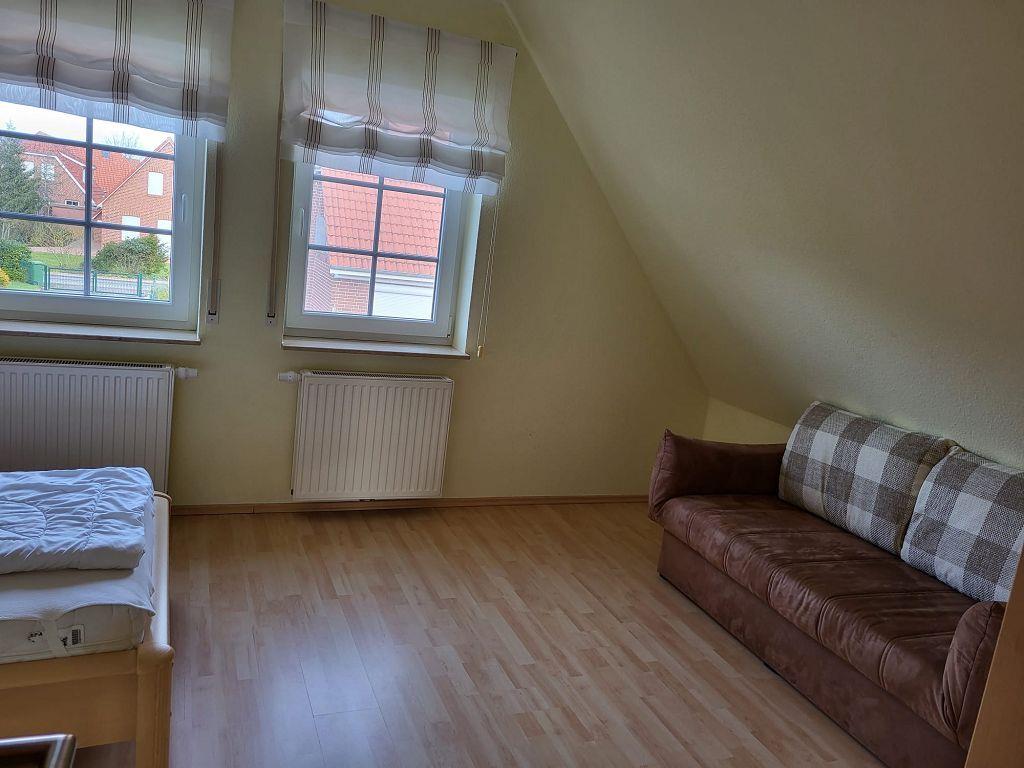 Im Obergeschoss befinden sich ein Schlafzimmer mit Doppelbett und eines mit einem Einzelbett und einer Schlafcouch. In beiden Räumen stehen ebenfalls Flachbild-TVs. Das Bad mit Badewanne und WC komplettiert das OG. Das Haus verfügt über Außenrollos! Die Terrasse mit gemütlichen Gartenmöbeln lädt zum Sonnenbaden oder Grillen am Steingrill ein (Grillrost gegen 30,00 € Pfand).