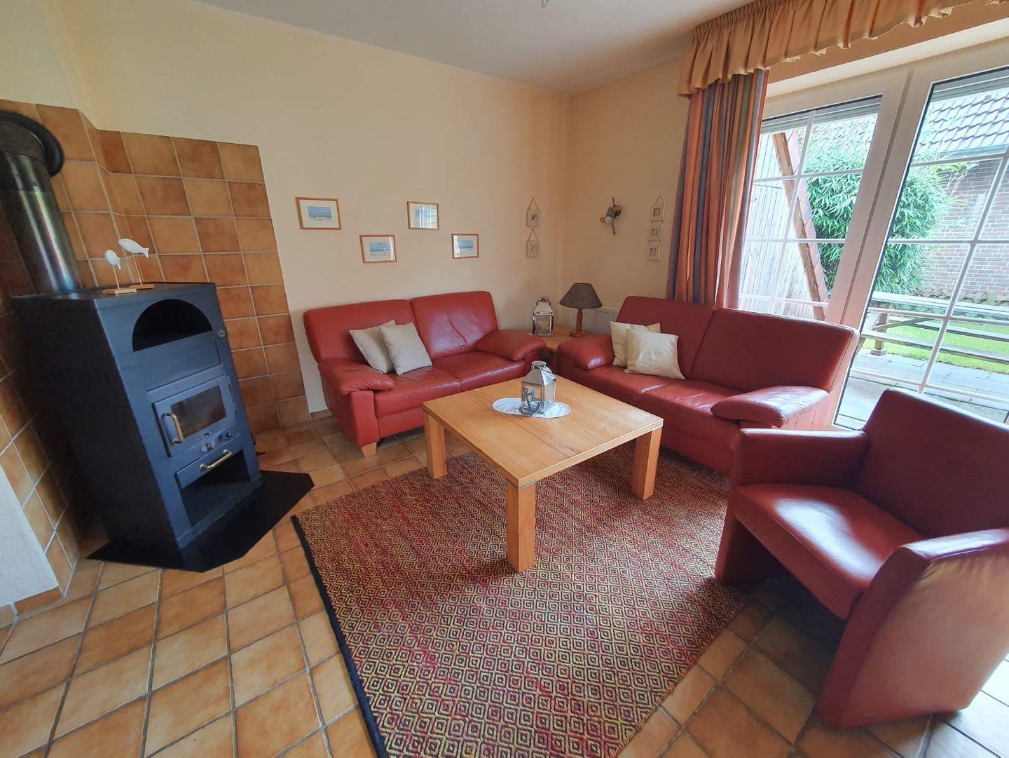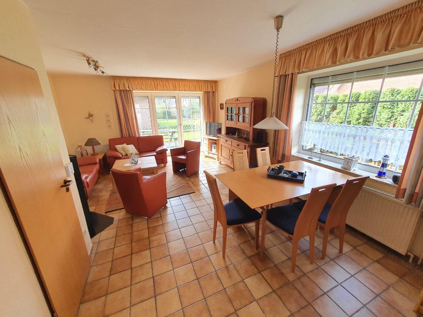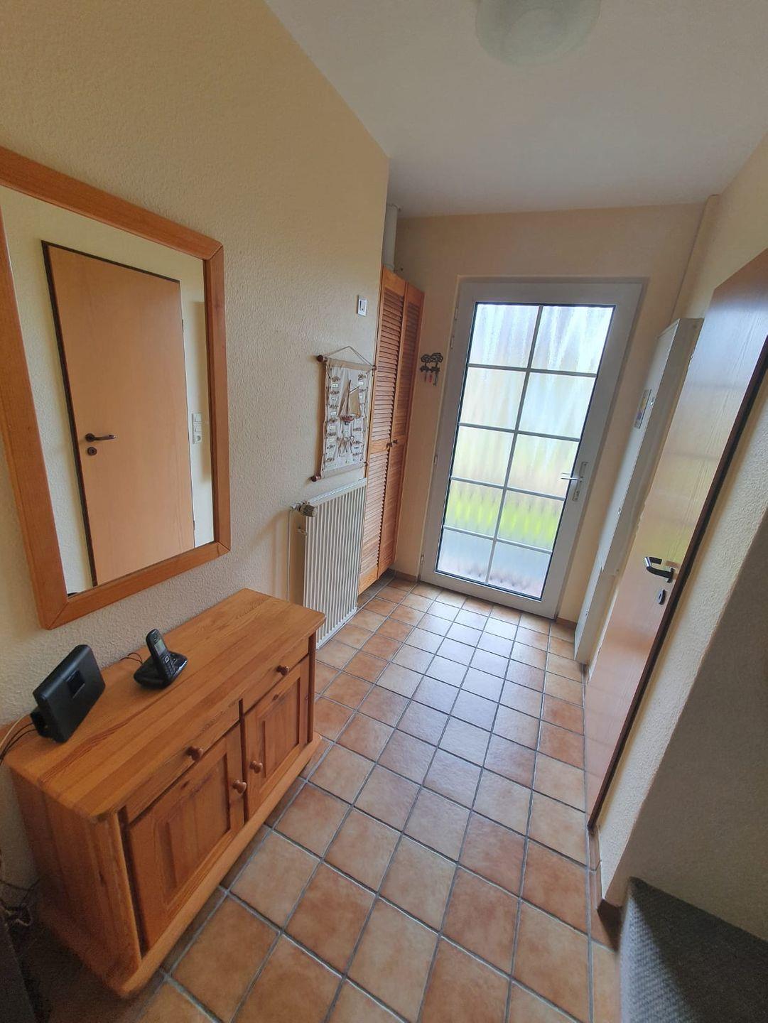 Willkommen im Ferienhaus Mupfel! Die helle gemütlich eingerichtete Doppelhaushälfte sorgt für Entspannung in Ihrem Urlaub. Es liegt in einer ruhigen Seitenstraße, ca. 5 Minuten zu Fuß zum Ortskern. Treten Sie ein! Durch den Flur gelangen Sie in den hellen Wohn- und Essbereich. Der Wohnbereich bietet eine gemütliche Ledercouch und 2 Sessel. Mit Flachbild-TV, Micro-Musikanlage können Sie entspannte Stunden genießen. Auch der Kamin lädt zu ruhigen (Kuschel-)Abenden ein. Von hier gelangen Sie auf die Terrasse, wo Sie die Seeluft genießen und sich den frischen Wind um die Nase wehen lassen können. Am großen Esstisch können bis zu 6 Personen z. B. das Abendessen genießen, Klönen, Spieleabende veranstalten usw. Sie blicken von hier direkt in den Garten. Angrenzend befindet sich die separate Küche mit Kühlschrank, Gefrierfach, Backofen, Cerankochfeld, Geschirrspüler, Mikrowelle und umfangreicher Ausstattung (z. B. Kaffeemaschine, Toaster, Eier- und Wasserkocher). Ein Telefonanschluß mit kostenfreier Einwahlmöglichkeit in das deutsche Festnetz finden Sie im Flur. WLAN ist ebenfalls verfügbar. Im Erdgeschoß gibt es noch ein Gäste-WC. Im Obergeschoß befinden sich 2 Schlafräume, eines mit einem Doppelbett und eines mit Einzelbetten. Ein Kinderbett, ein Hochstuhl sowie ein Wickeltisch stehen für die Kleinen bereit. Hier kommen Sie auch in das helle Duschbad. Durch das zweite Schlafzimmer gelangen Sie zum Schlafraum im Dachgiebel, wo ebenfalls noch 2 Einzelbetten stehen. Hier gibt es einen Relaxsessel und ein Flachbild-TV - Entspannung pur. Alle Fenster verfügen über Außenrollos! Eine Waschmaschine, Bügelbrett/-eisen, eine Wäschespinne für den Außenbereich stehen für die Wäschepflege zur Verfügung. Abstellkammern sind im Innen- und Außenbereich vorhanden. Zum Haus gehört ein eigener Parkplatz auf dem Gelände der Eigentumsanlage.