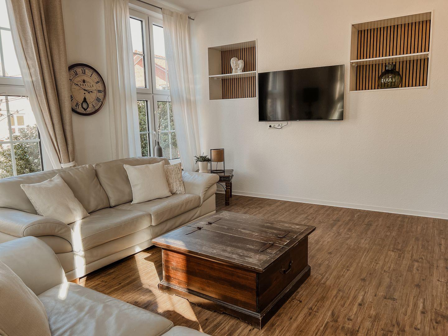Mit einer großzügigen Fläche von 120 m² erwartet Sie Wohnraum, der zu Entspannung und Geselligkeit einlädt. Die offene Küche, ausgestattet mit hochwertigen Geräten wie einem Cerankochfeld, Backofen, Kühlschrank und Geschirrspüler, bietet alles, was Sie für die Zubereitung köstlicher Mahlzeiten benötigen. Der einladende Essbereich und die Sofaecke im Wohnzimmer laden zum gemeinsamen Essen und Verweilen ein. Genießen Sie gemütliche Abende in einen der zwei geschmackvoll eingerichteten Schlafzimmern, während Sie den Tag Revue passieren lassen oder einen Film auf einem der zwei Fernseher anschauen.