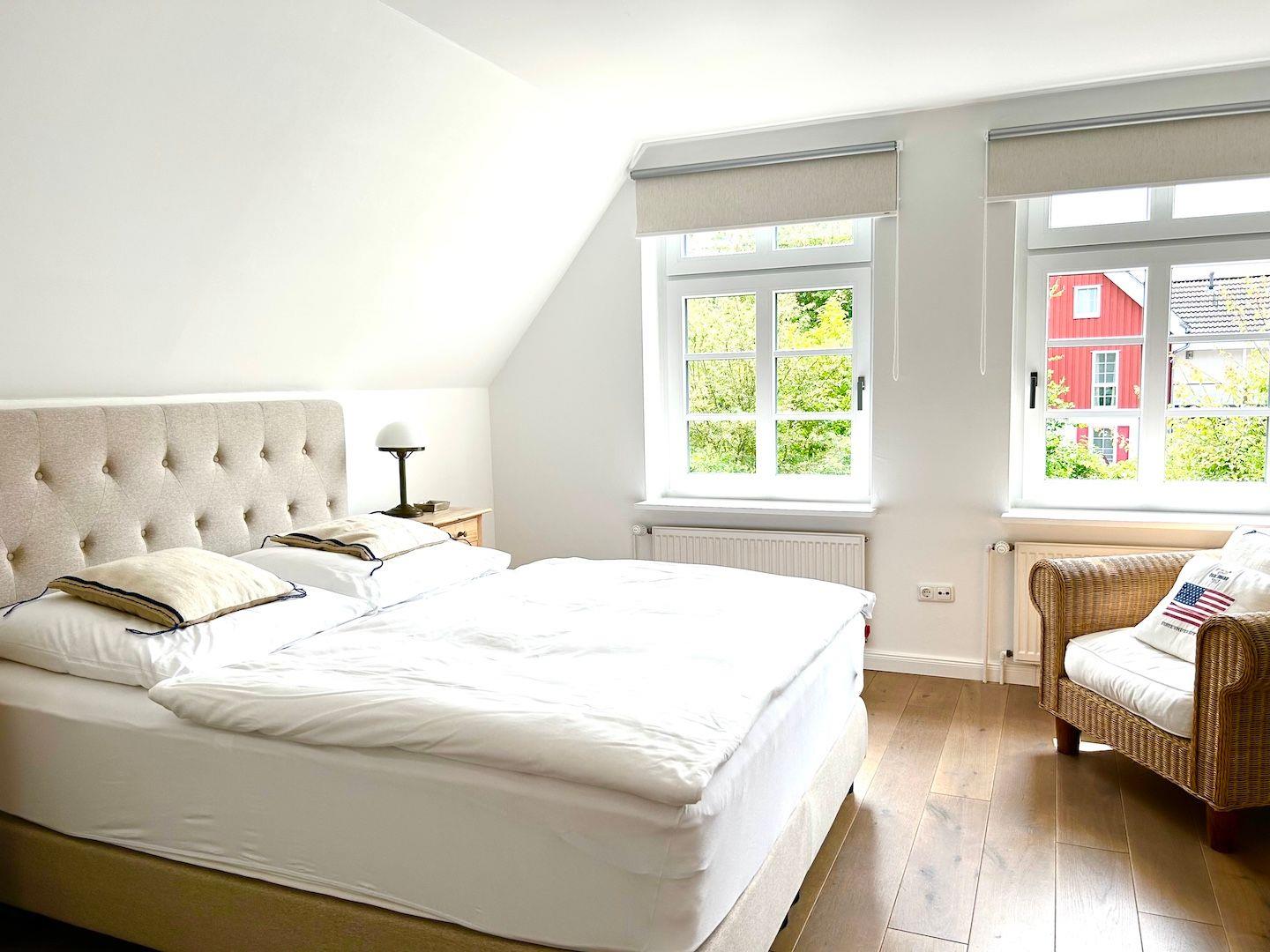 Im Obergeschoss finden Sie das große Masterschlafzimmer mit einem hochwertigen Boxspring-Doppelbett und ein Gästezimmer mit zwei Einzelbetten vor. Ein weiteres Badezimmer mit Dusche und WC ermöglicht eine entspannte Morgenroutine. Für stille Momente lädt die Bibliothek mit Schreibstübchen zum Verweilen ein.