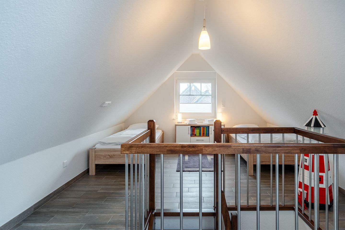Dachgeschoss: Über eine Holztreppe gelangen Sie in das Dachgeschoss, wo zwei Einzelbetten und ein zusätzliches WC untergebracht sind.