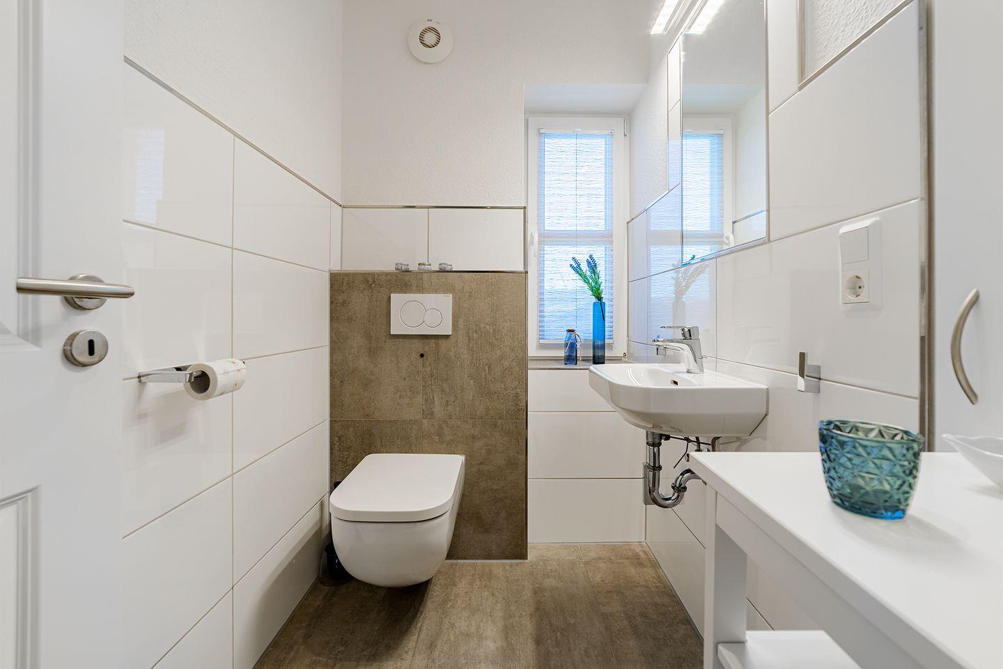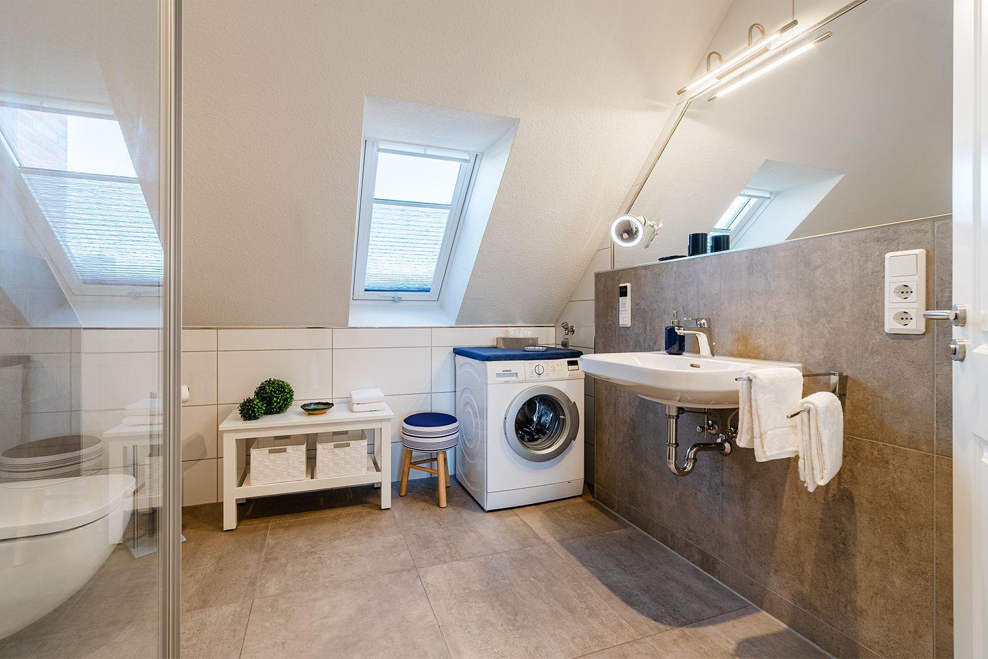 Das Bad ist mit einer Dusche und einer Waschmaschine ausgestattet – ideal für längere Aufenthalte. Zudem gibt es ein zusätzliches Gäste-WC für noch mehr Komfort.