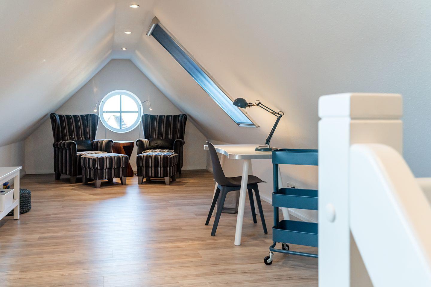 Ein ausgebautes Dachgeschoss dient als zusätzlicher Rückzugsort. Hier können Sie sich zurücklehnen und entspannen oder bei Bedarf arbeiten.