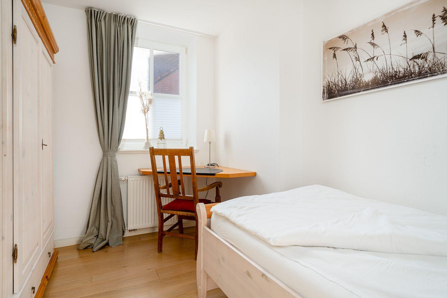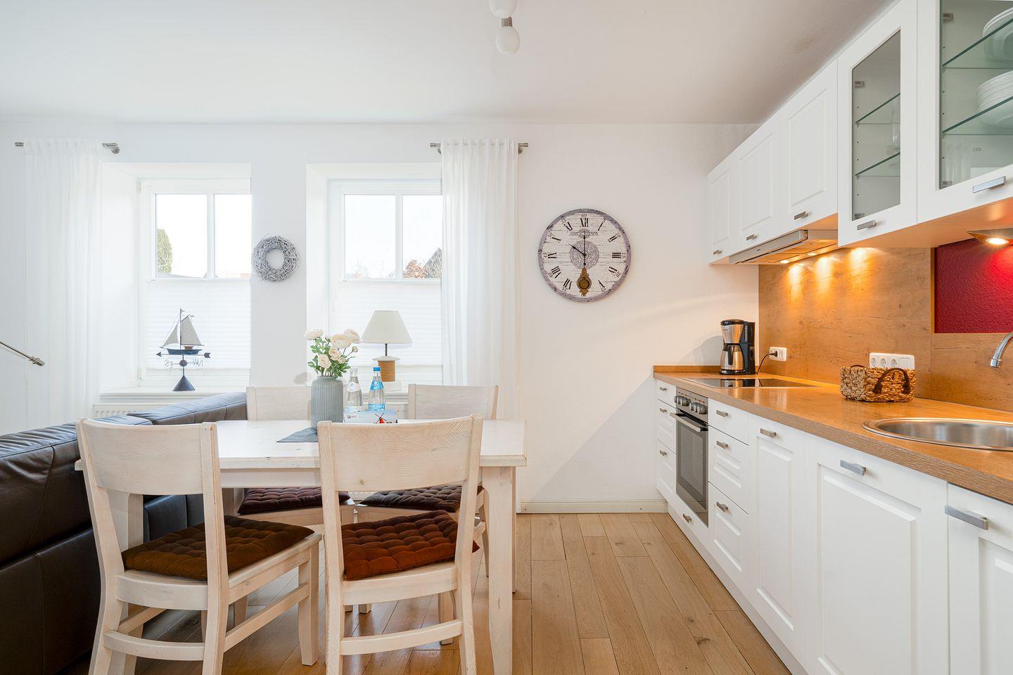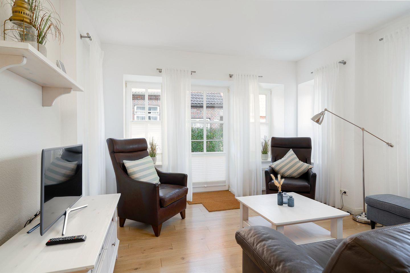 Die Wohnung befindet sich in einem 2011 kernsanierten Haus aus 1788 und liegt in einer ruhigen Seitenstraße, aber dennoch unmittelbar im Ortskern von Greetsiel.