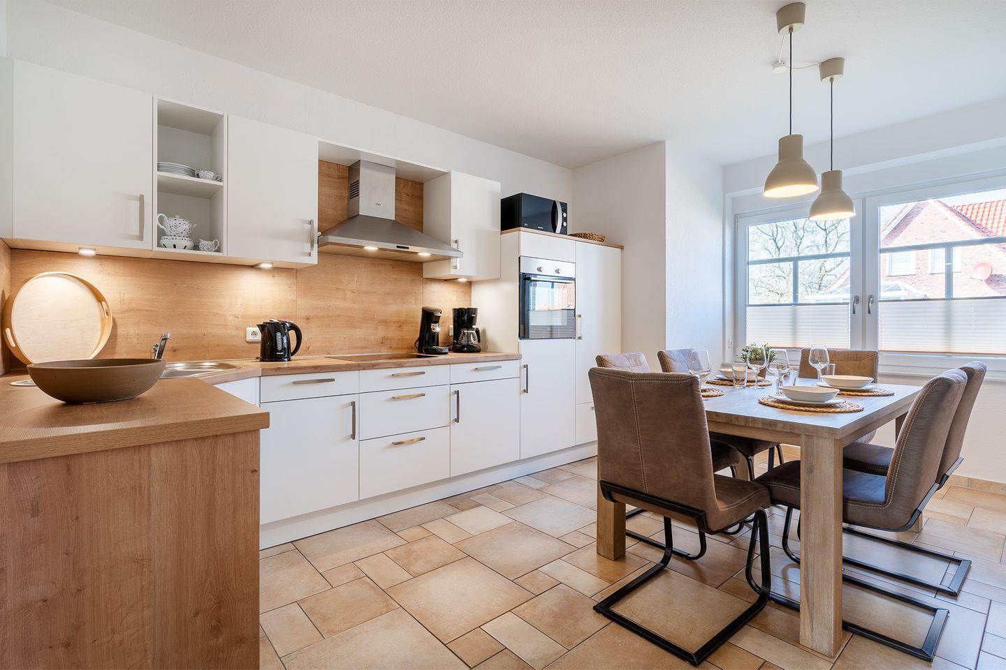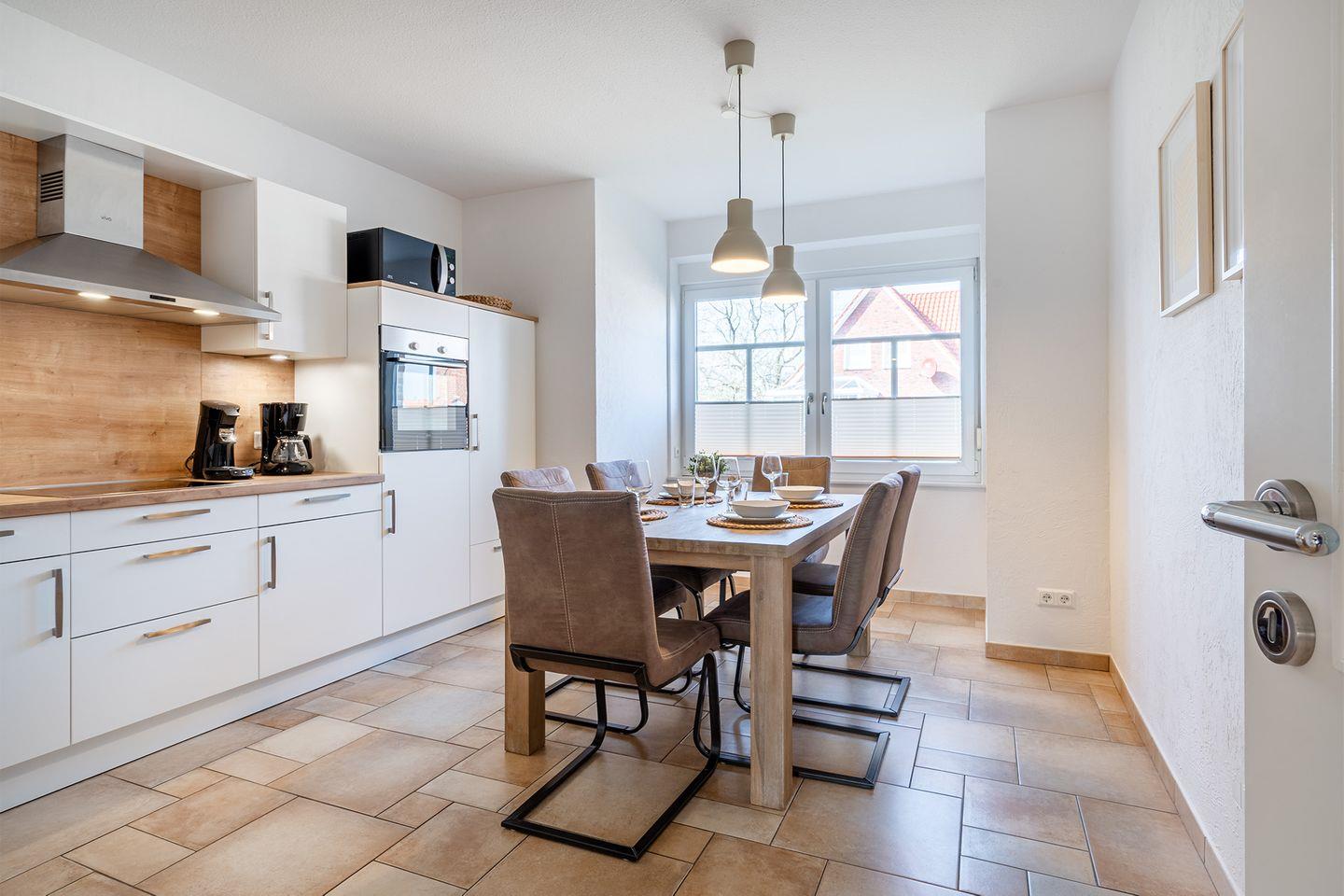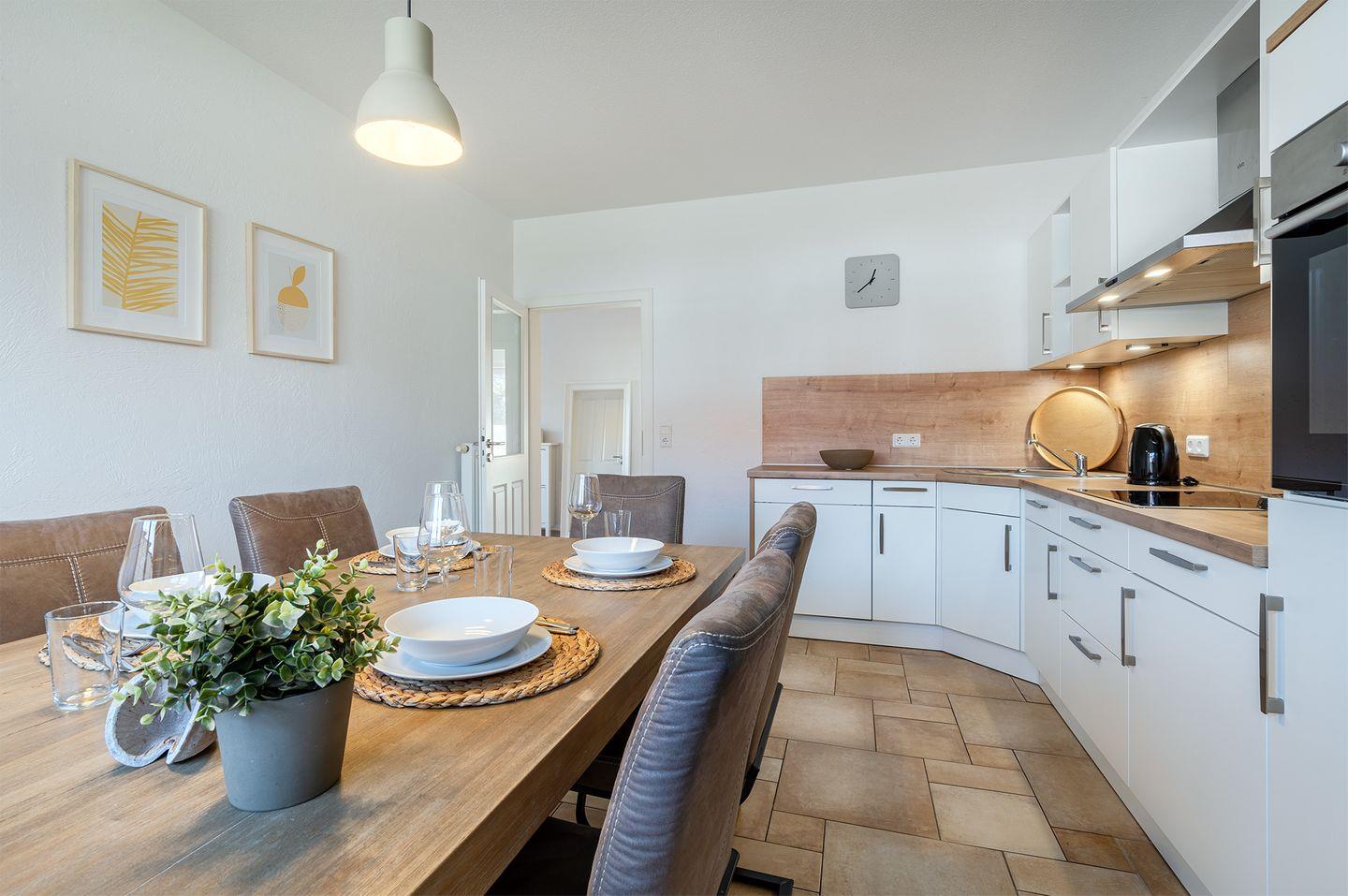 Die vollständig ausgestattete Küche mit einem großen Essplatz lädt ein, gemeinsam zu kochen und zu essen. Hier kommen alle zusammen und schaffen schöne Erinnerungen.