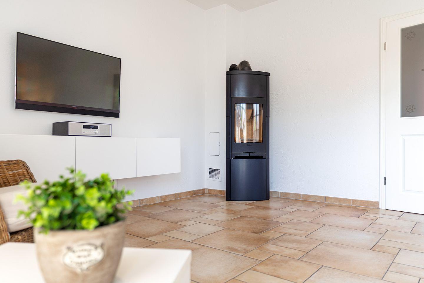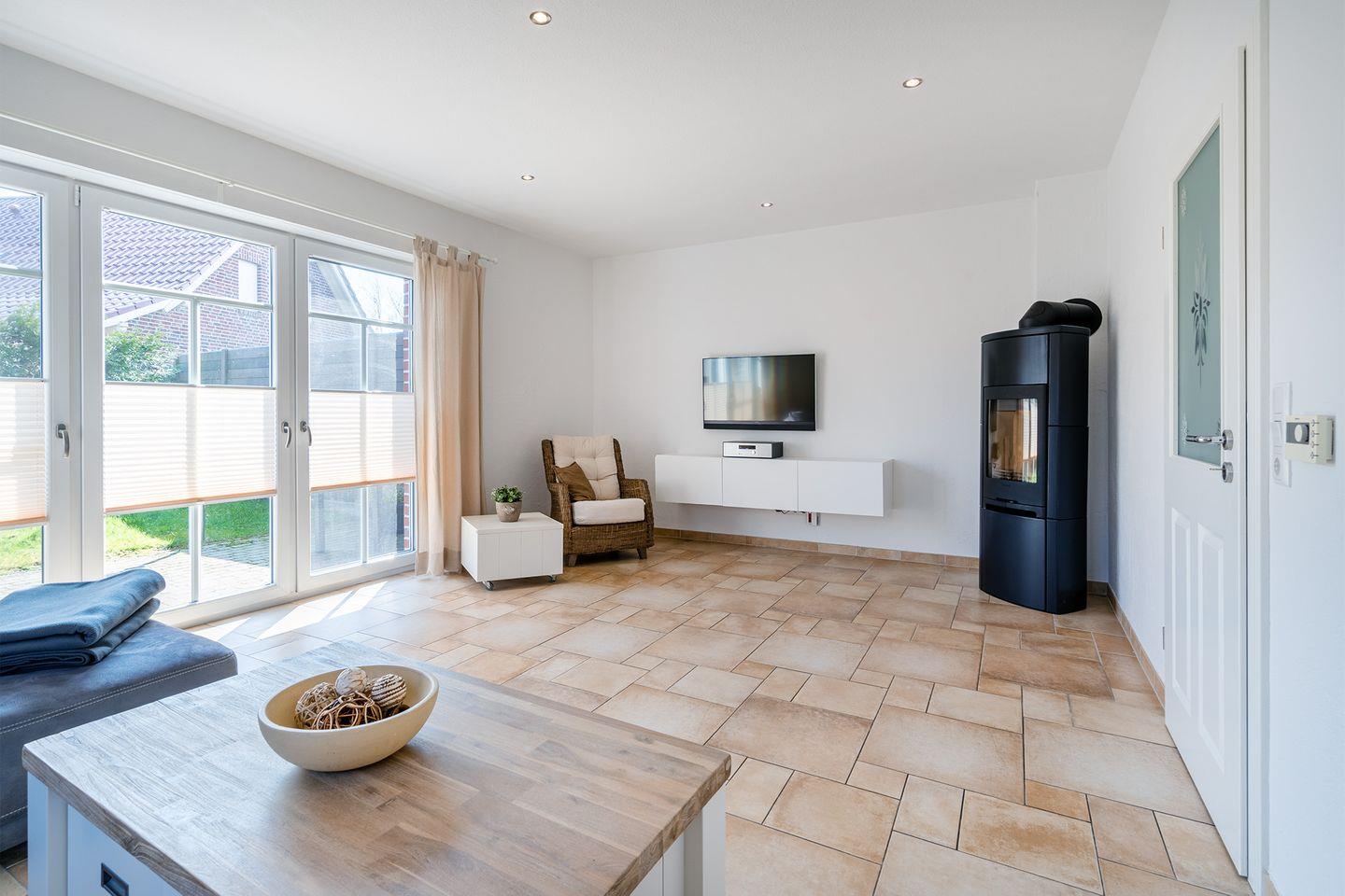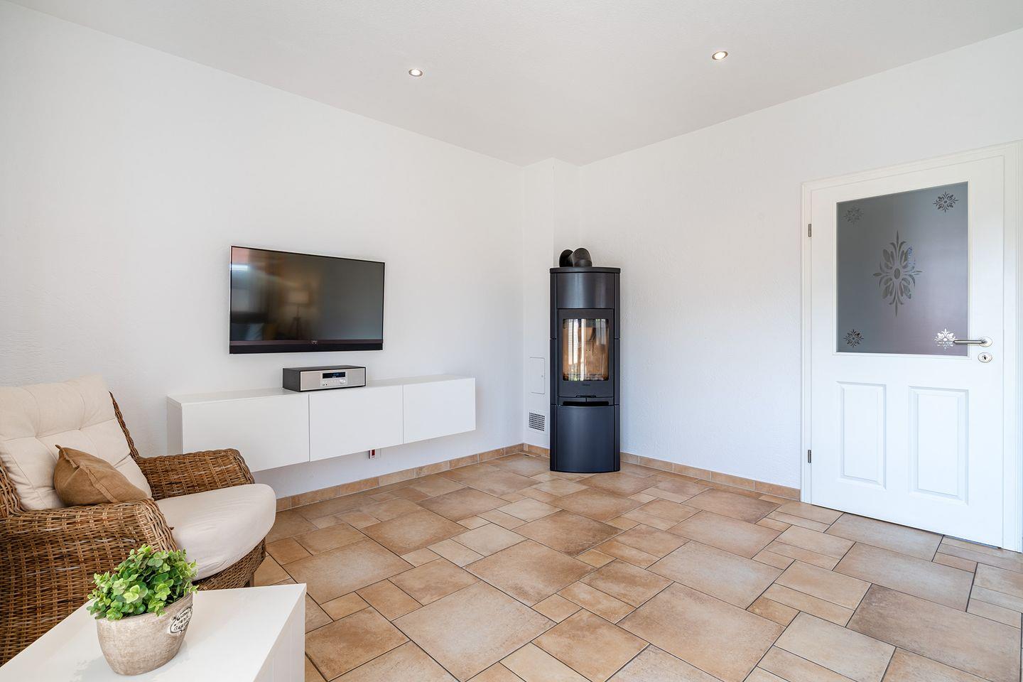 Das großzügige Wohnzimmer wird durch große, bodentiefe Fenster lichtdurchflutet und sorgt für eine einladende Atmosphäre. Der Kaminofen ist besonders an kalten Wintertagen ein gemütlicher Mittelpunkt, um den Tag entspannt ausklingen zu lassen.