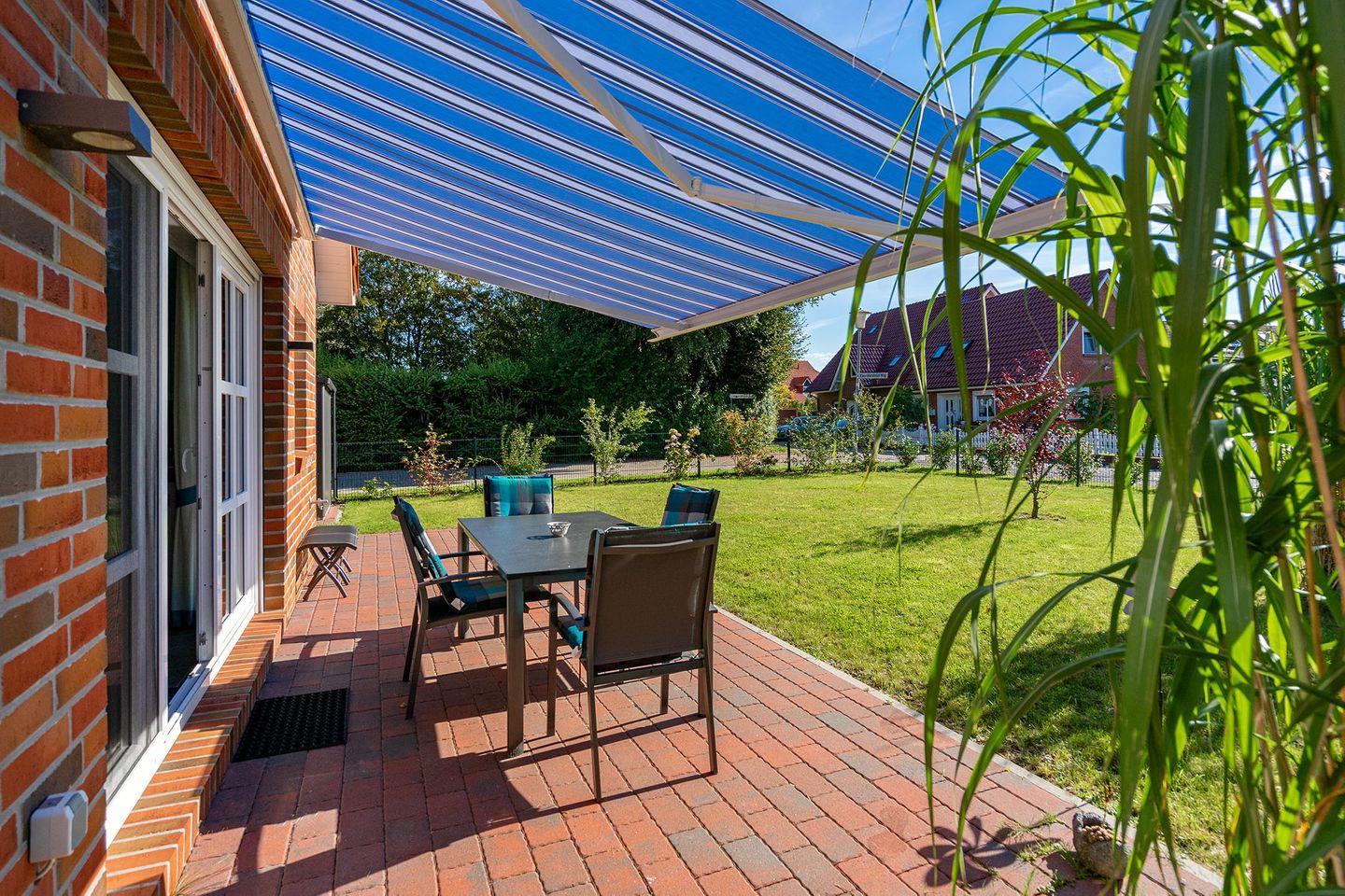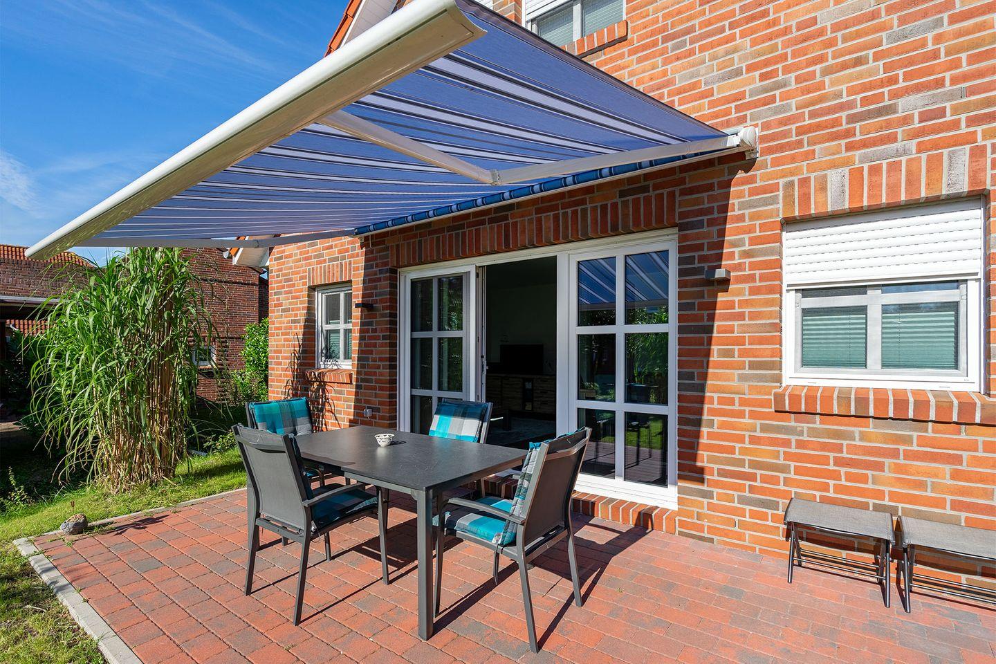 Eine großzügige Terrasse mit Gartenmöbeln und Markise